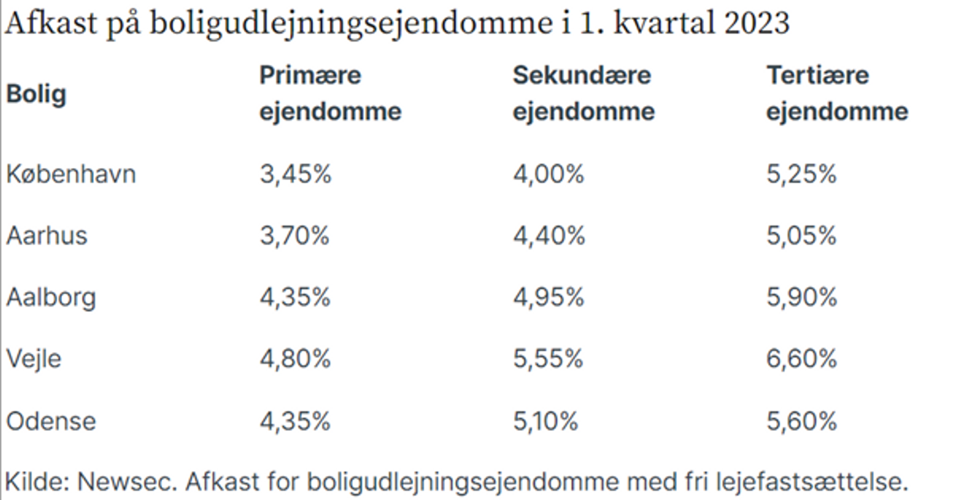 Afkastet for primære boligudlejningsejendomme med fri markedsleje i det centrale København lå i 1. kvartal 2023 omkring 3,45 pct. og på 3,50-3,80 pct. i andre dele af byen. Afkastet for boligudlejningsejendomme af mere sekundær kvalitet lå omkring 4,00-4,50 pct. Afkastet på primære ejendomme i det centrale Aarhus lå på omkring 3,70 pct. og på 4,35-4,80 pct. i andre store provinsbyer.