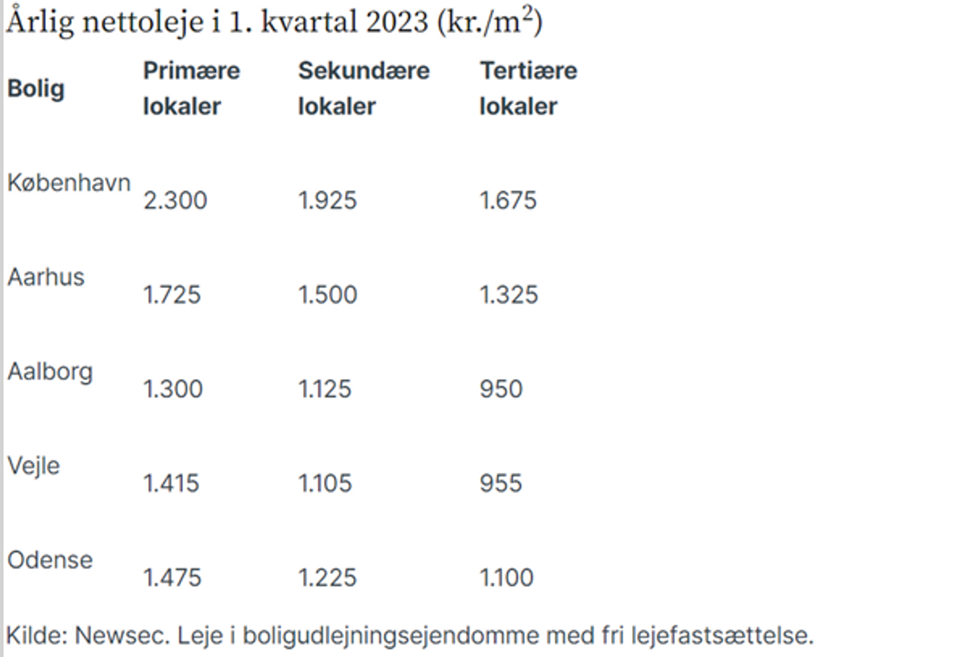 I 1. kvartal 2023 lå lejen i de bedste boligudlejningsejendomme i det centrale København på omkring 2.300 kr. pr. m2 og på 1.900-2.250 kr. pr. m2 i andre dele af byen. Huslejen i ejendomme af mere standardmæssig kvalitet lå typisk i et interval på 1.600-2.000 kr. pr. m2. I Aarhus var niveauet omkring 1.725 kr. pr. m2 og 1.300-1.475 kr. pr. m2 i landets andre store byer.