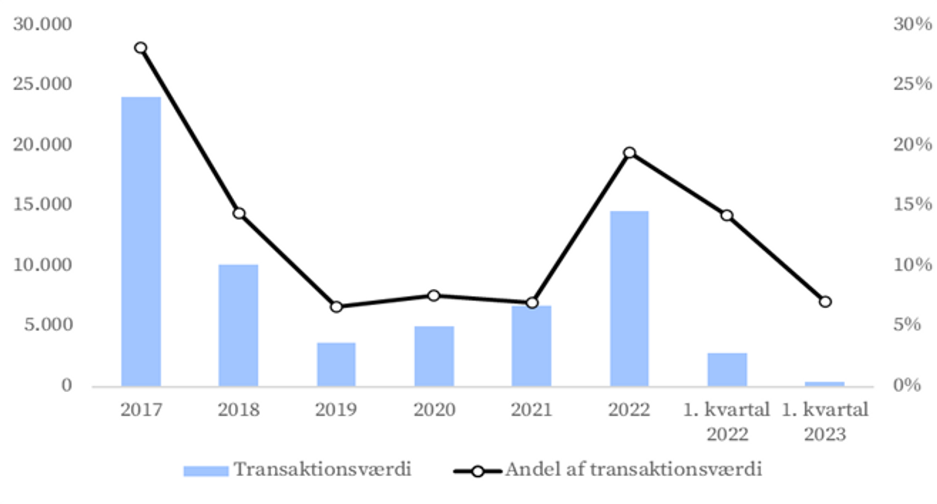 Den høje transaktionsværdi i 2022 skyldtes, at der blev gennemført nogle meget store handler med bl.a. stormagasiner, indkøbscentre samt porteføljer med dagligvarebutikker. Blandt de største handler i 2022 var Peek & Cloppenburgs erhvervelse af fire Magasinejendomme samt Jeudans køb af Galleri K. Handelsaktiviteten har indtil videre været meget begrænset i 2023 med transaktioner for kun knap 0,5 mia. kr. i årets 1. kvartal