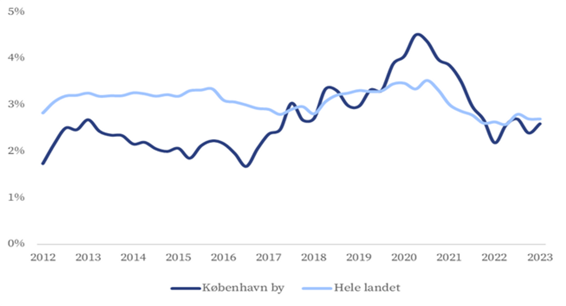 Udlejning – Udlejningsaktiviteten aftog i København i 2022 sammenlignet med 2021, der var præget af høj aktivitet. Udlejningsaktiviteten aftog yderligere i 1. kvartal 2023.