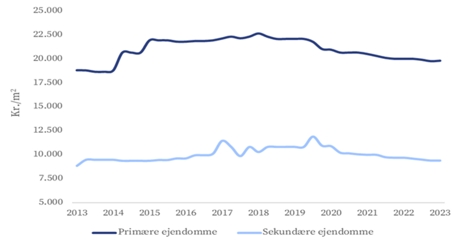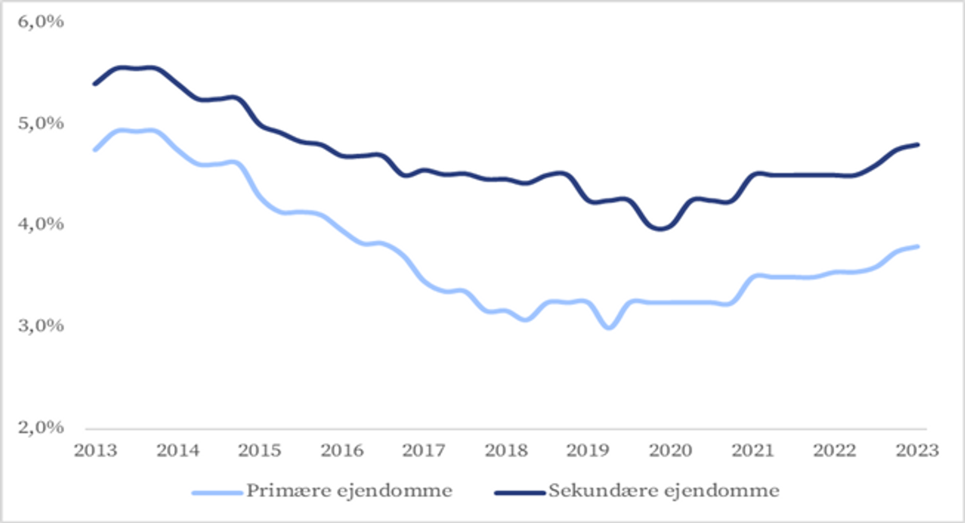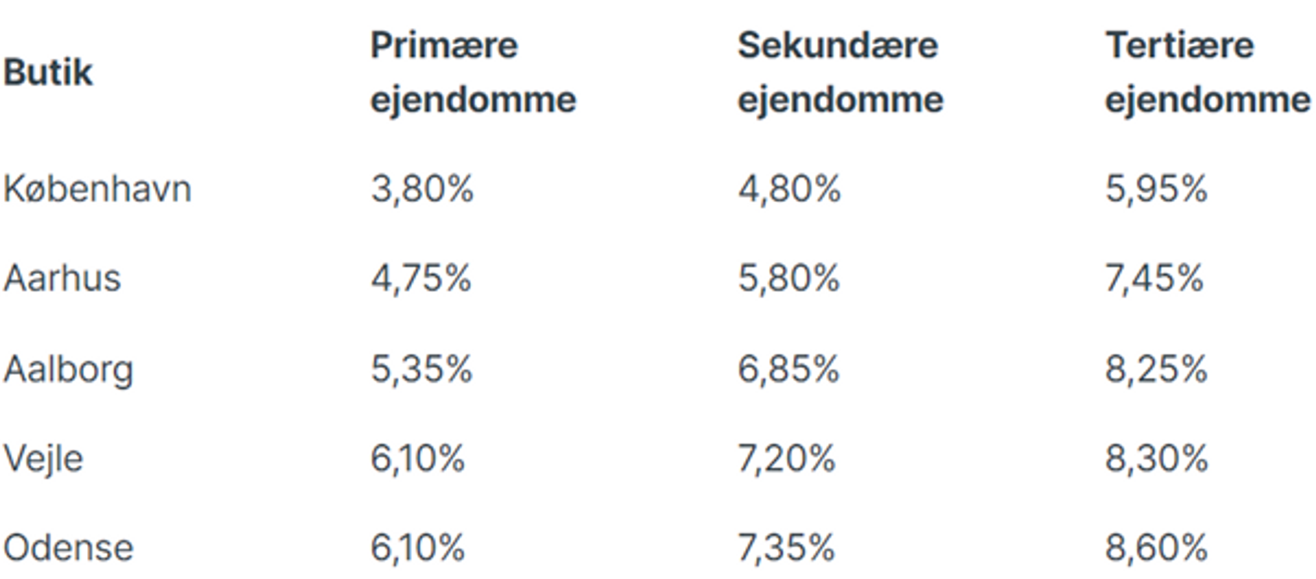 Afkast – Afkastniveauet har været stigende siden starten af 2022. Stigningen vurderes at have været størst for tertiære ejendomme (ejendomme med en kvalitet og beliggenhed under standard og med betydelig udlejningsrisiko). For denne type ejendomme er afkastet steget med 0,25-1,00 procentpoint. For sekundære ejendomme er afkastet 0,25-0,85 procentpoint højere, mens det typisk er steget med 0,20-0,65 procentpoint for primære ejendomme.