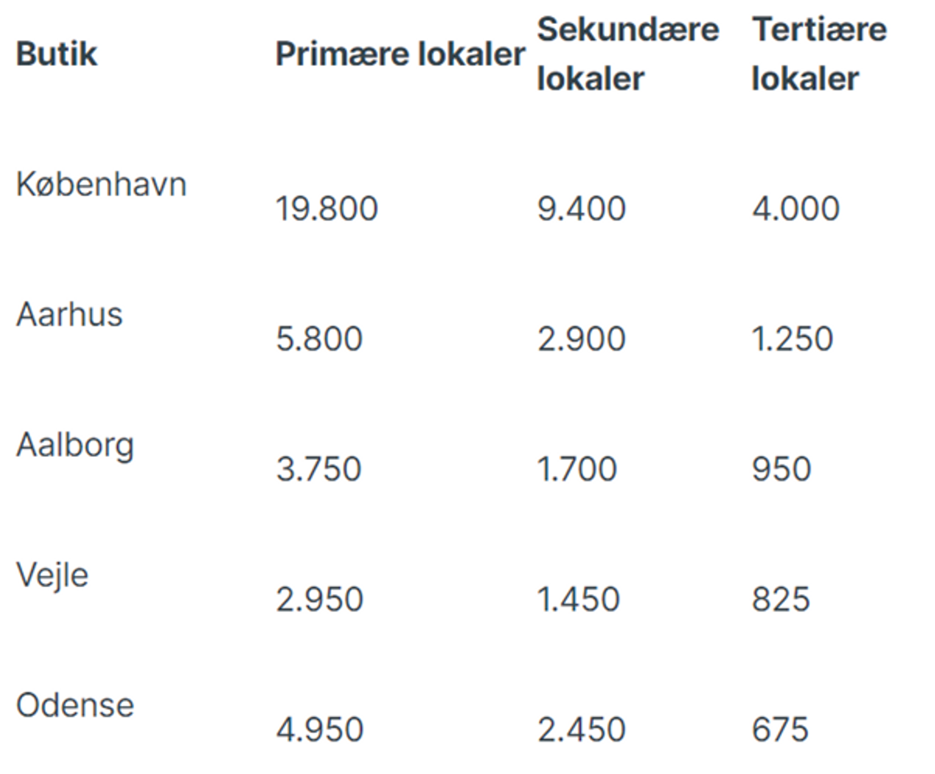På de centrale beliggenheder i det indre København lå den primære butiksleje i 1. kvartal 2023 omkring 19.000-20.000 kr. pr. m2. Butiksleje på dette niveau ses dog kun i et fåtal af de mest attraktive ejendomme på, og omkring, Strøget. I andre dele af byen lå lejen typisk mellem 1.950-3.550 kr. pr. m2. I det centrale Aarhus var niveauet knap 6.000 kr. pr. m2, mens det i andre større provinsbyer lå i et interval på 3.000-5.000 kr. pr. m2.