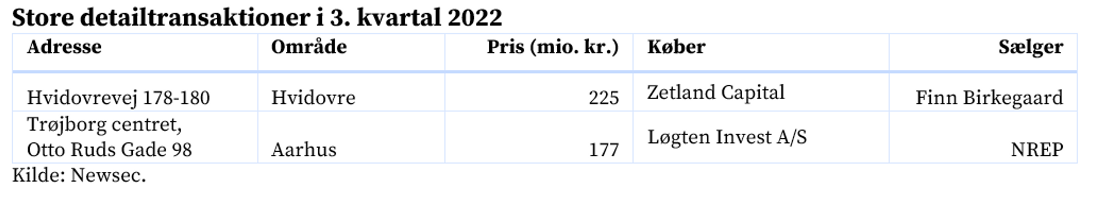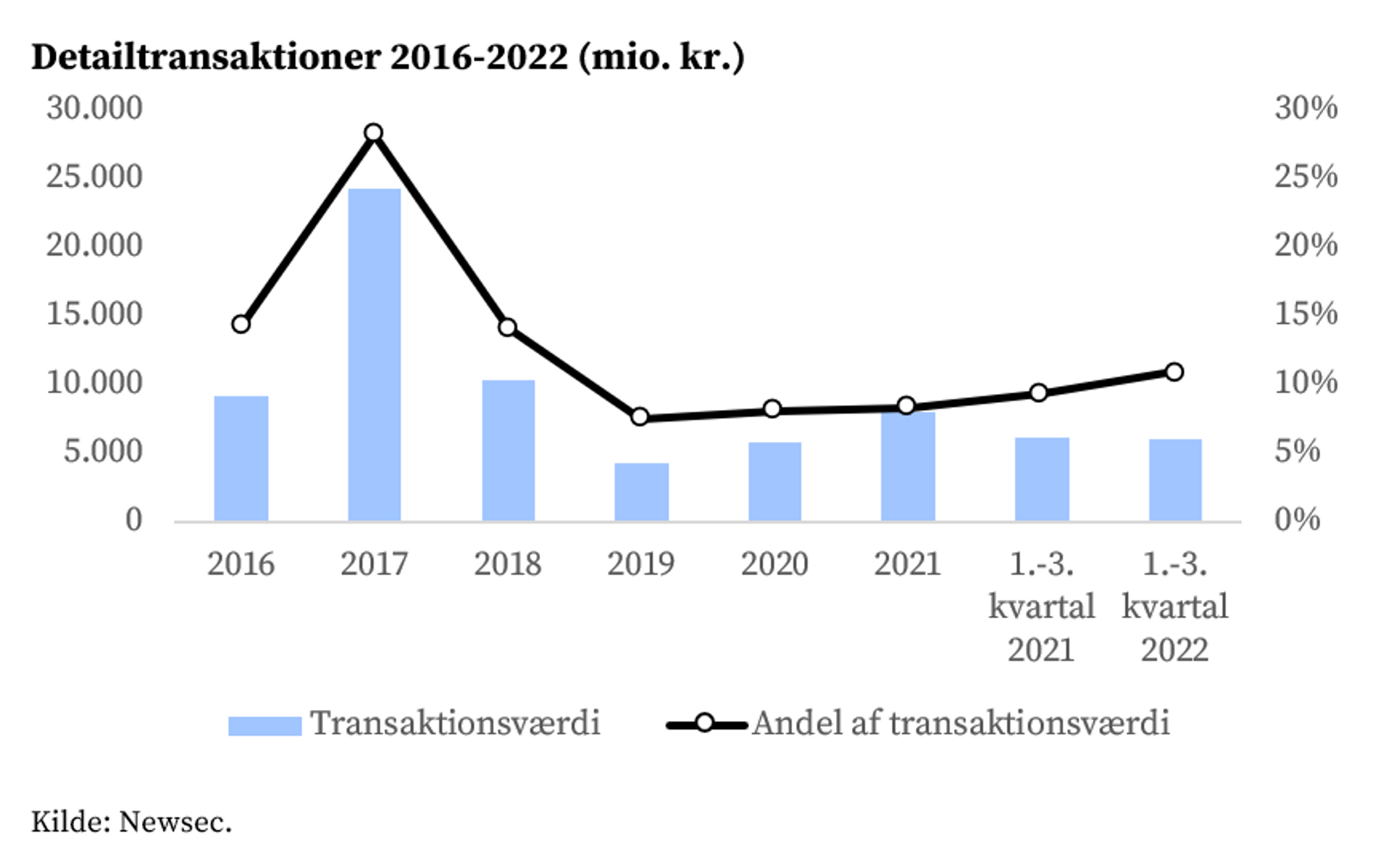 Investorernes interesse for detailejendomme har været behersket i de senere år, men der var fremgang at spore i 2021, hvor der blev handlet detailejendomme for 8 mia. kr. I indeværende del af 2022 er der solgt ejendomme for 6,1 mia. kr., hvilket var uændret i forhold til året før. I 3. kvartal blev der handlet ejendomme for 0,9 mia. kr. Det er et relativt højt niveau, og næsten dobbelt så højt som i 3. kvartal sidste år.