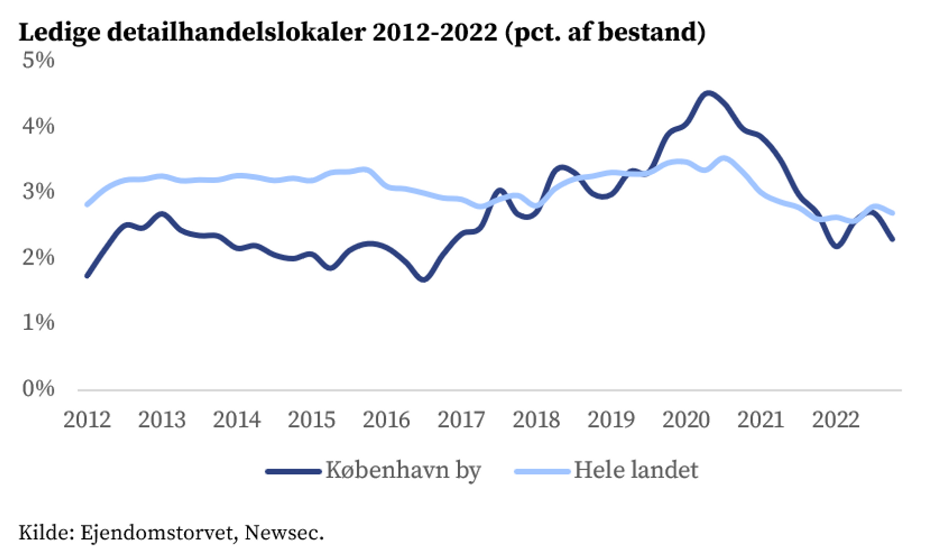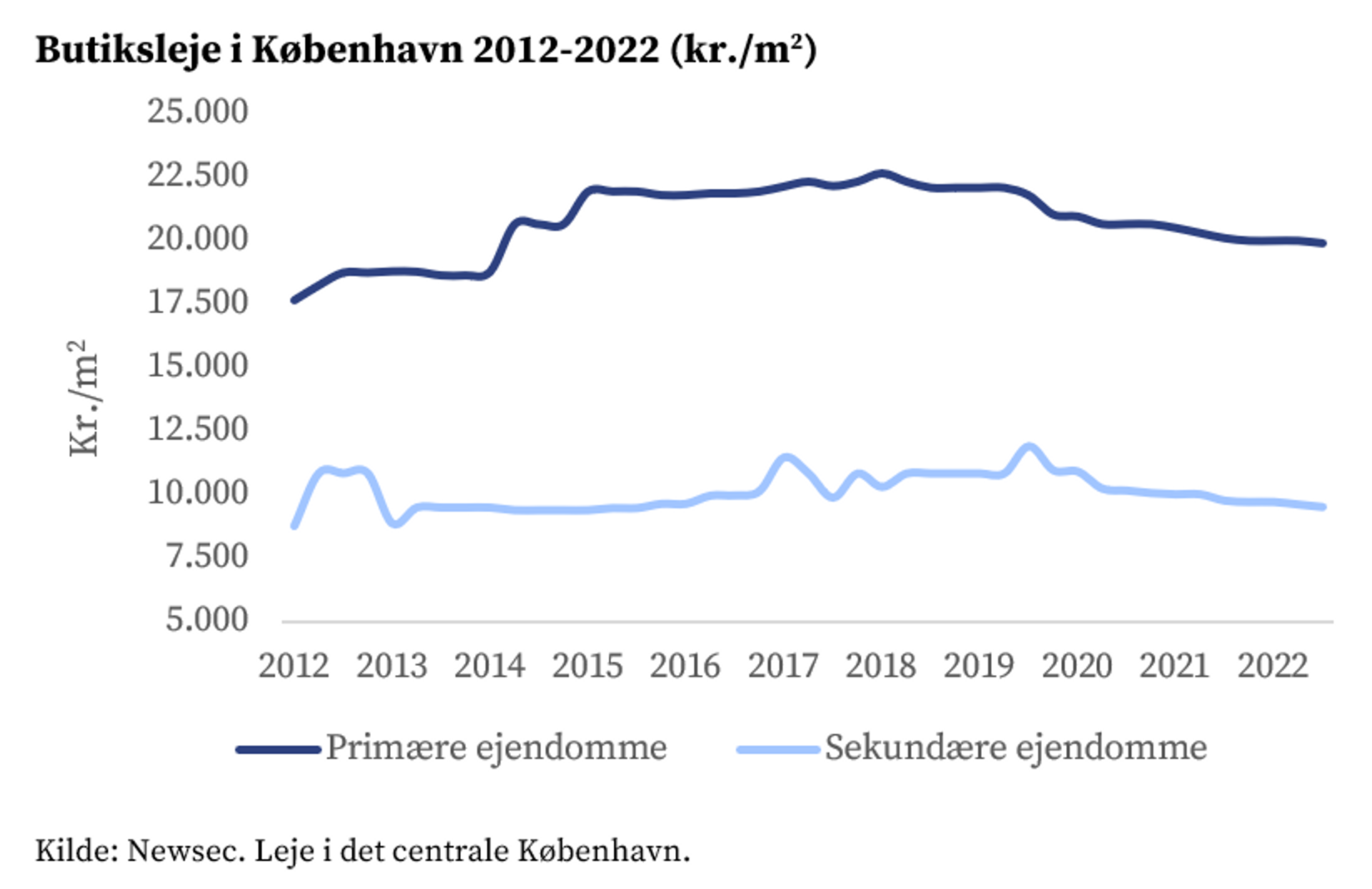 Lejeniveauerne for butikslokaler har været faldende i de fleste større byer, herunder også i København, i en årrække. Efter en kortvarig stabilisering fra midten af 2021, er lejen atter kommet under pres.