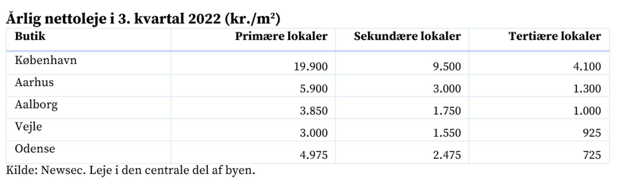 På de centrale beliggenheder i indre København ligger den primære butiksleje i underkanten af 20.000 kr. pr. m2. Butiksleje på dette niveau ses dog kun i et fåtal af de mest attraktive ejendomme på, og omkring, Strøget. I andre dele af byen ligger lejen mellem 1.900-3.500 kr. pr. m2.