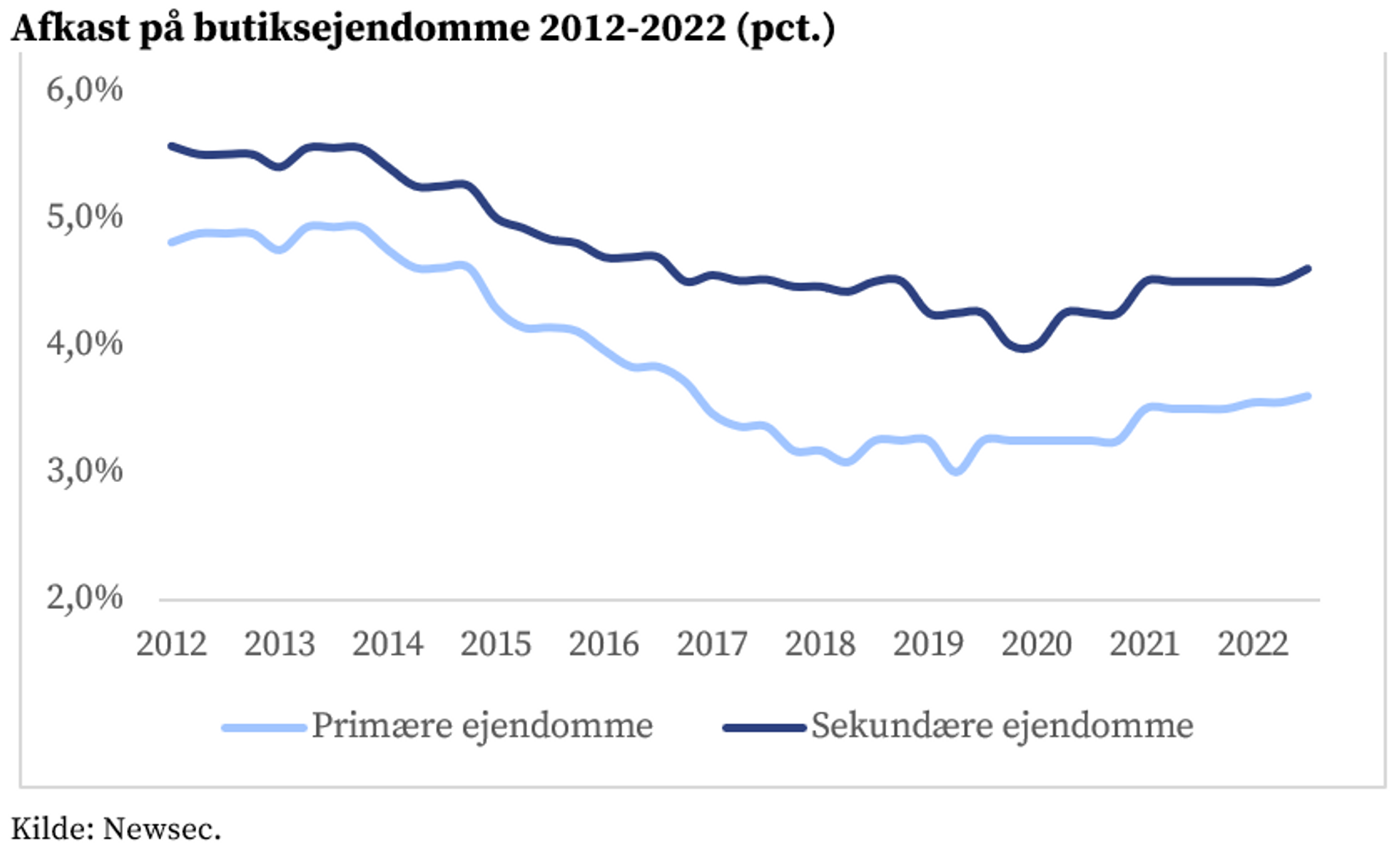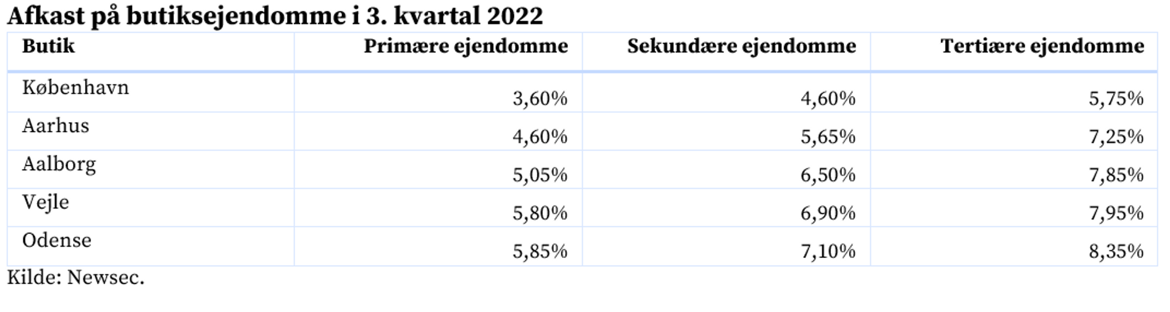 Afkastet for primære butiksejendomme ligger på omkring 3,60 pct. i det centrale København og på 4,50-6,00 pct. i andre dele af byen.