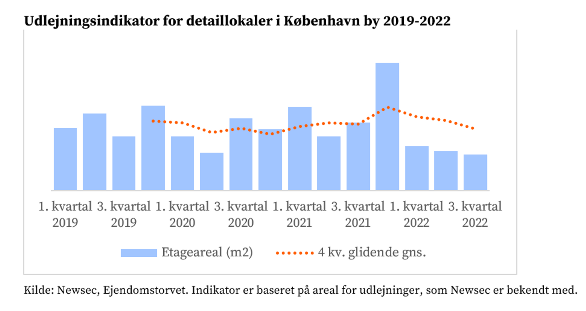 Privatforbrug og detailsalg er faldet mærkbart siden efteråret 2021. Det presser detailhandlen, hvilket kan aflæses i en rekordlav konjunkturindikator. I København har udlejningsaktiviteten været aftagende i 2022 - efter en kort periode med stigning i 2021.