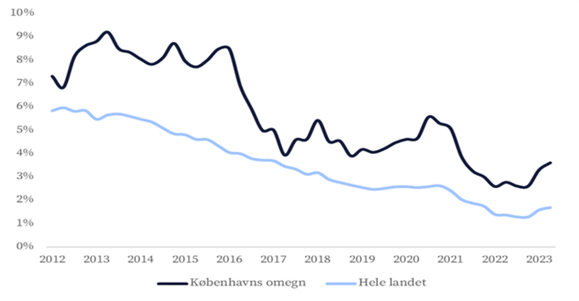 Tomgang – Udbuddet af ledige lokaler har været faldende i en længere årrække. Den store efterspørgsel i 2021 betød, at omfanget af ledige lokaler blev reduceret markant. Den nedadgående tendens stoppede i 2022. På landsplan steg tomgangen fra 1,4 pct. i starten af 2022 til 1,6 pct. ved starten af 2023, og den steg marginalt til 1,7 pct. i 1. kvartal 2023. I Københavns omegn steg ledigheden fra 2,6 pct. til 3,3 pct. i 2022. I 1. kvartal 2023 steg den yderligere til 3,6 pct. Ledigheden er også steget i Aahus, Odense, Aalborg og Sydjylland (med Trekantområdet).