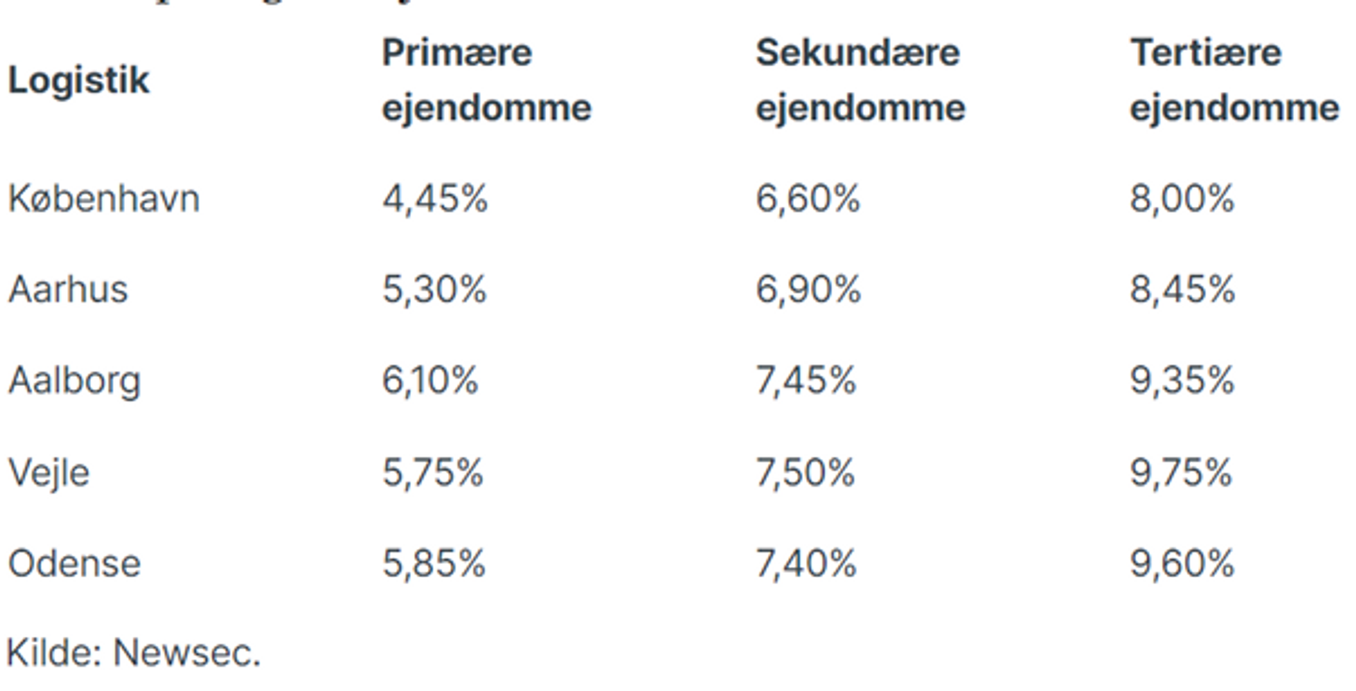 Afkastet på primære logistikejendomme i København ligger omkring 4,50 pct. for de mest attraktive ejendomme. Afkastet på sekundære ejendomme ligger omkring 6,65 pct.