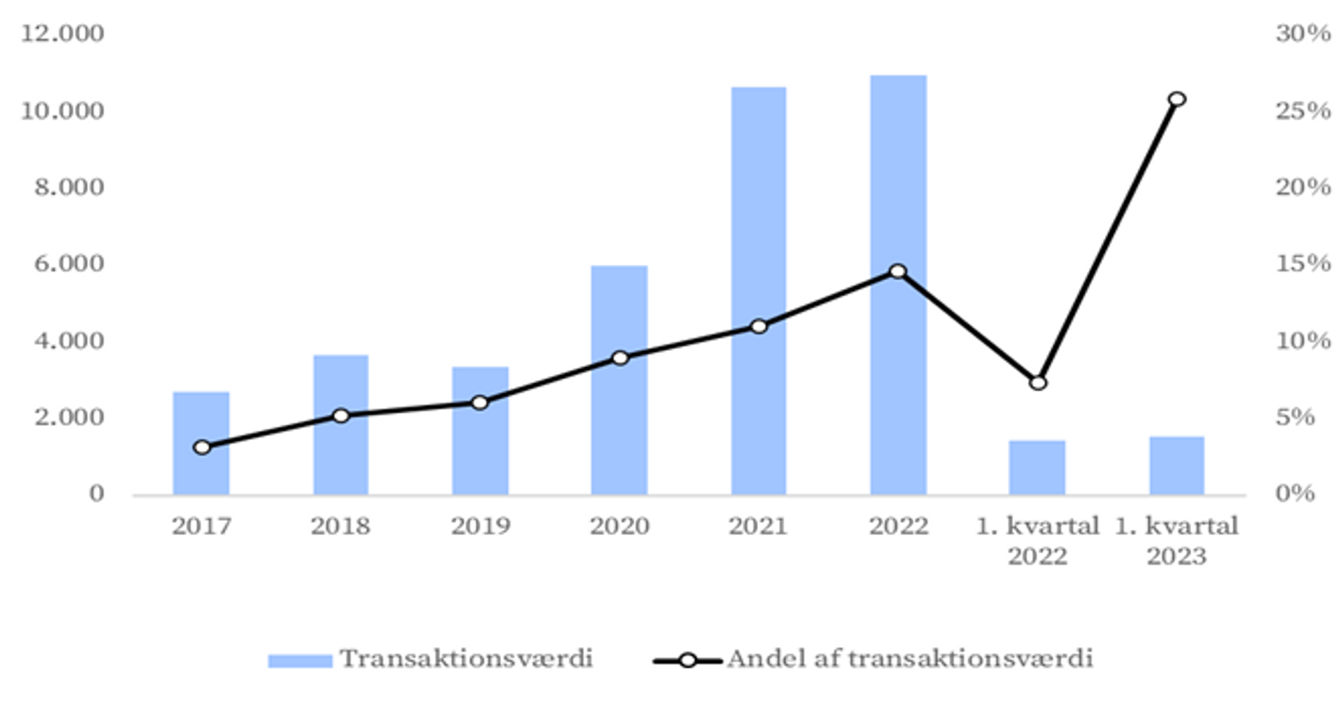 Transaktionsværdi – Interessen for industriejendomme har været stigende i mange år. Der blev omsat industriejendomme for 11 mia. kr. i 2022. Det var på niveau med 2021, og et højt niveau historisk set. I 2022 tegnede segmentet sig for 15 pct. af de samlede ejendomsinvesteringer. Til sammenligning var andelen kun 4 pct. i 2017.
