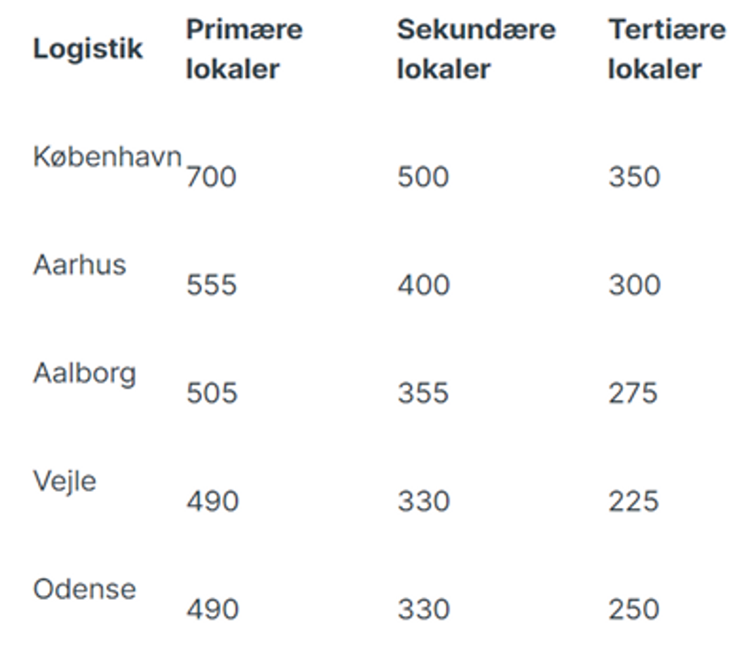Leje – Lejeniveauet har været stigende i en årrække. Udviklingen er fortsat igennem hele 2022 og ind i 2023. Lejen for de mest attraktive logistiklokaler i København lå i 1. kvartal omkring 700 kr. pr. m2 og omkring 500 kr. pr. m2 for lokaler af mere standardmæssig kvalitet.