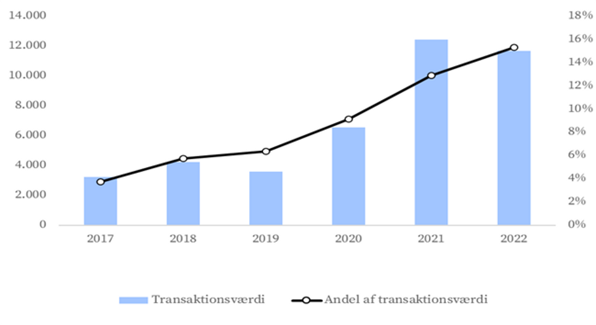 Transaktionsværdi – Interessen for industriejendomme har været stigende i mange år. Der blev omsat industriejendomme for 11,7 mia. kr. i 2022. Det var lidt mindre end i 2021, men et højt niveau historisk set. I 2022 tegnede segmentet sig for 15 pct. af de samlede ejendomsinvesteringer. Til sammenligning var andelen kun 4 pct. i 2017.
