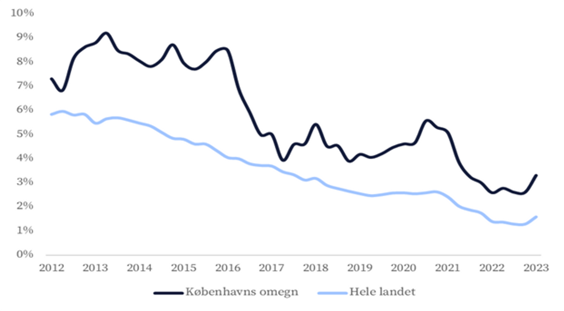 Tomgang – Udbuddet af ledige lokaler har været faldende i en længere årrække. Den store efterspørgsel i 2021 betød, at omfanget af ledige lokaler blev reduceret markant. Den nedadgående tendens stoppede i 2022. På landsplan steg tomgangen fra 1,4 pct. i starten af 2022 til 1,6 pct. ved starten af 2023. I Københavns omegn steg ledigheden fra 2,6 pct. til 3,3 pct. Ledigheden steg også i Aahus og Aalborg til hhv. 1,9 pct. og 1,5 pct. I Odense og Sydjylland (med Trekantområdet) var ledigheden stort set uændret.