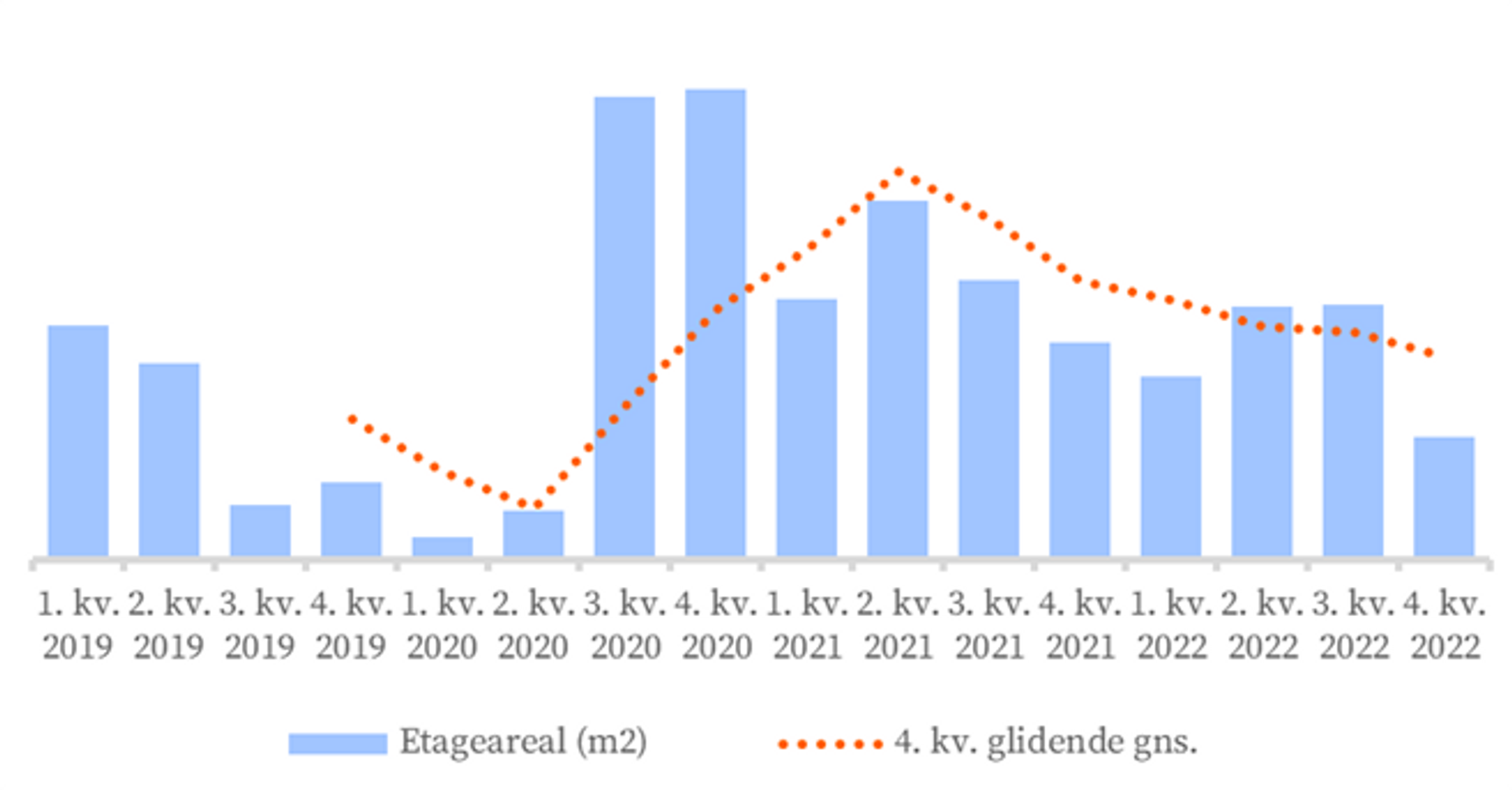 Udlejning – Udlejningsaktiviteten i Københavns omegn steg markant fra midten af 2020 og lå på et højt niveau i 2021. Newsec’s udlejningsindikator viser en lavere udlejningsaktivitet i 2022 i både Københavns omegn og på landsplan. Afmatningen er dog sket dog fra et højt niveau i 2021.