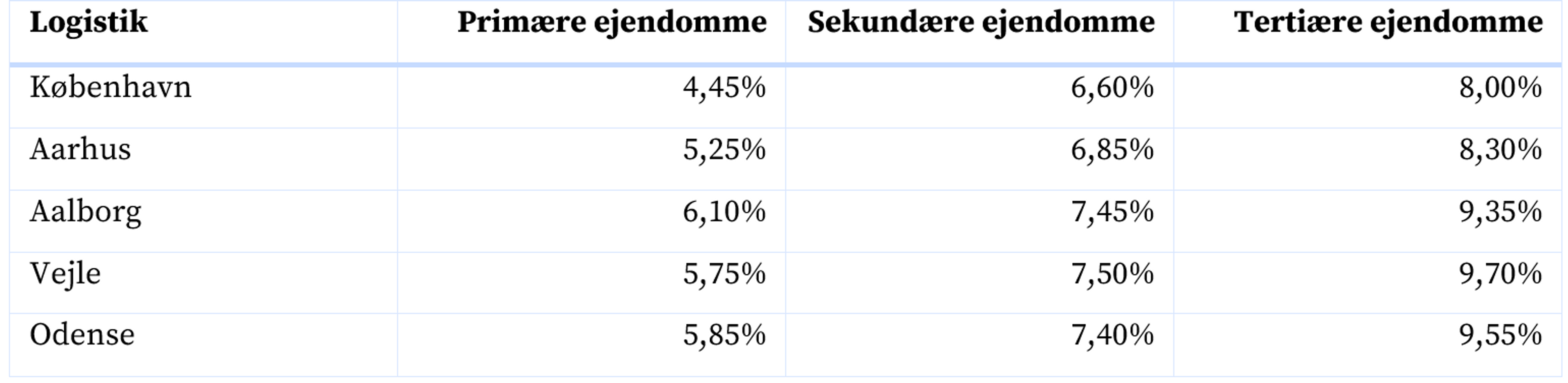 Afkastet på primære logistikejendomme i København ligger omkring 4,45 pct. for de mest attraktive ejendomme. Afkastet på sekundære ejendomme ligger omkring 6,60 pct.