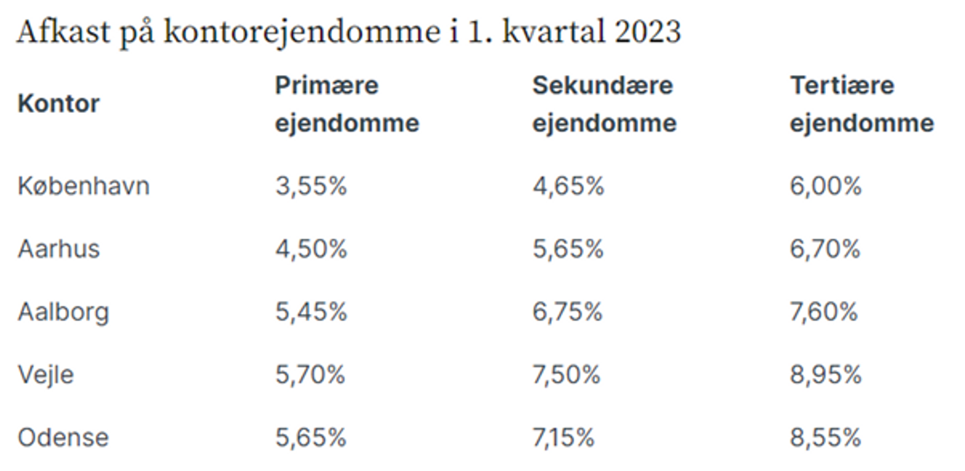 Afkastet på primære kontorejendomme i det centrale Aarhus ligger omkring 4,50 pct. og 5,45-5,65 pct. for de bedste kontorer i de øvrige store provinsbyer.