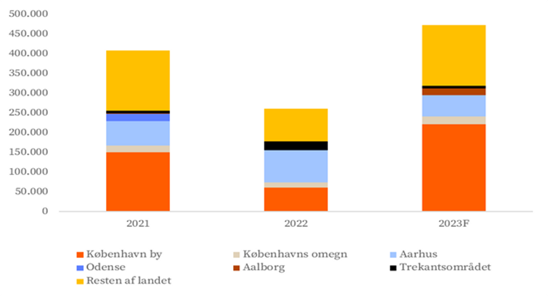 Københavnsområdet tiltrækker normalt størstedelen af kontorhandlerne i Danmark. I 2022 var omkring 66 pct. af transaktionsværdien lokaliseret her. Investeringsaktiviteten var begrænset i resten af landet, hvilket skal ses i lyset af, at markedet udenfor Københavnsområdet stort set udelukkende blev drevet af lokale danske købere af små ejendomme. Kun 20 pct. af de store transaktioner over 100 mio. kr. lå udenfor Københavnsområdet.