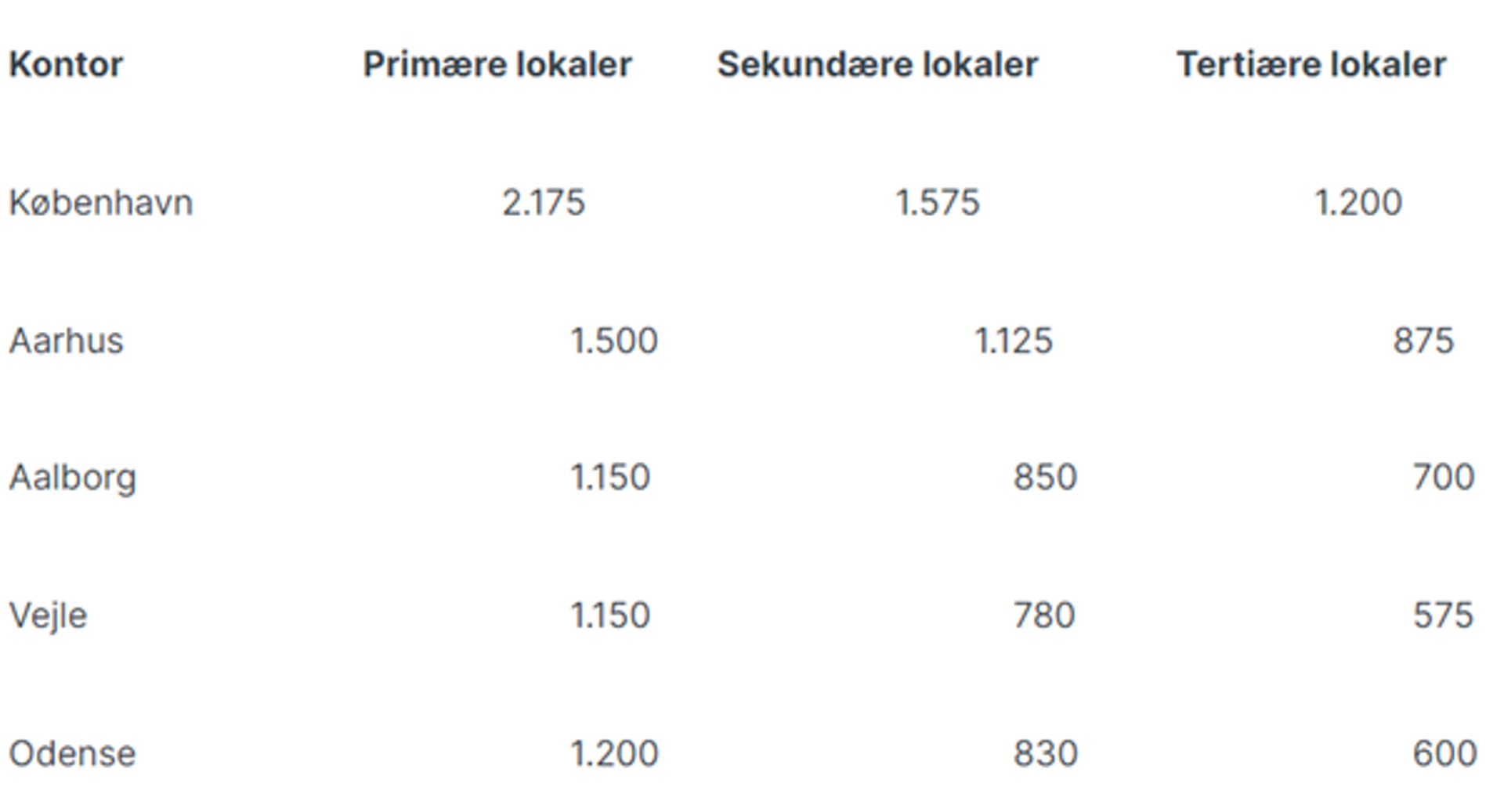 Lejen for primære kontorejendomme i det centrale Aarhus lå på omkring 1.500 kr. pr. m2 og på 1.150-1.200 kr. pr. m2 for de bedste kontorer i de øvrige store provinsbyer.