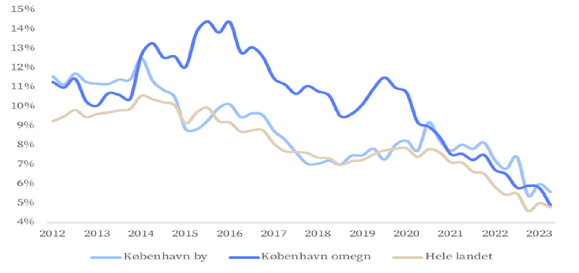 Tomgang – Den positive efterspørgsel efter kontorer i København har reduceret omfanget af ledige kontorer. Kontorledigheden i København by faldt fra 7,2 pct. i starten af 2022 til 6,0 pct. i starten af 2023, og yderligere til 5,6 pct. i 1. kvartal 2023. I Københavns omegn faldt kontorledigheden fra 6,7 pct. til 5,8 pct. i 2022 og til 4,9 pct. i 1. kvartal 2023. I begge områder er omfanget af tomme kontorer langt under gennemsnittet for de sidste 10 år. Ledigheden er også faldende i Odense og Aalborg og lå på hhv. 7,3 pct. og 4,2 pct. i 1. kvartal 2023. I Aarhus har ledigheden ligget nogenlunde konstant siden starten af 2022, og var i 1. kvartal 6,0 pct. På landsplan blev ledigheden reduceret fra 5,9 pct. til 5,0 pct. i 2022, og faldt yderligere til 4,8 pct. i 1. kvartal 2023.