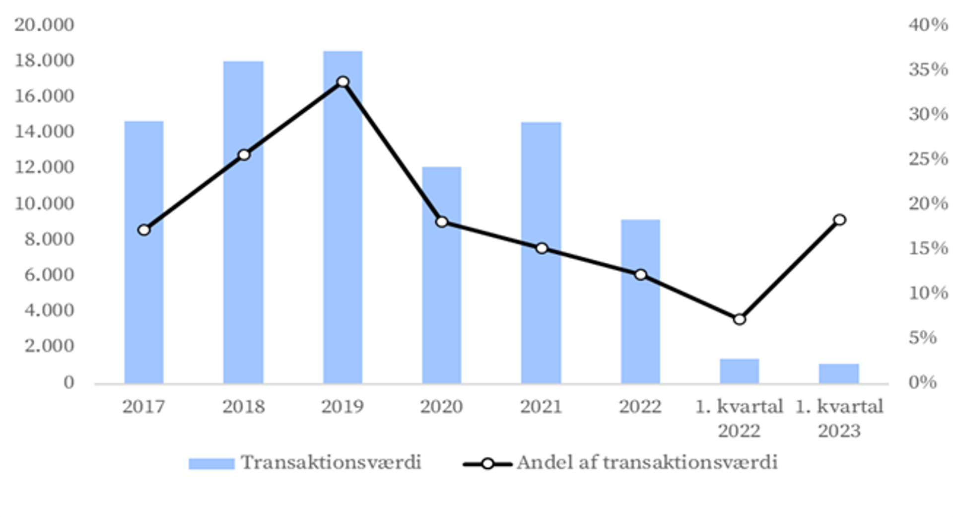 Transaktionsværdi – Kontorejendomme stod for 20 pct. af de samlede ejendomsinvesteringer i femårsperioden 2017-2021, men andelen har været faldende i de seneste tre år. Fra 2019-2022 faldt andelen fra 32 pct. til 12 pct. Kontorinvesteringerne var på 9 mia. kr. i 2022, hvilket var 37 pct. lavere end i 2021. I 1. kvartal blev der handlet kontorejendomme for godt 1 mia. kr. Det var 23 pct. lavere end samme periode 2021.