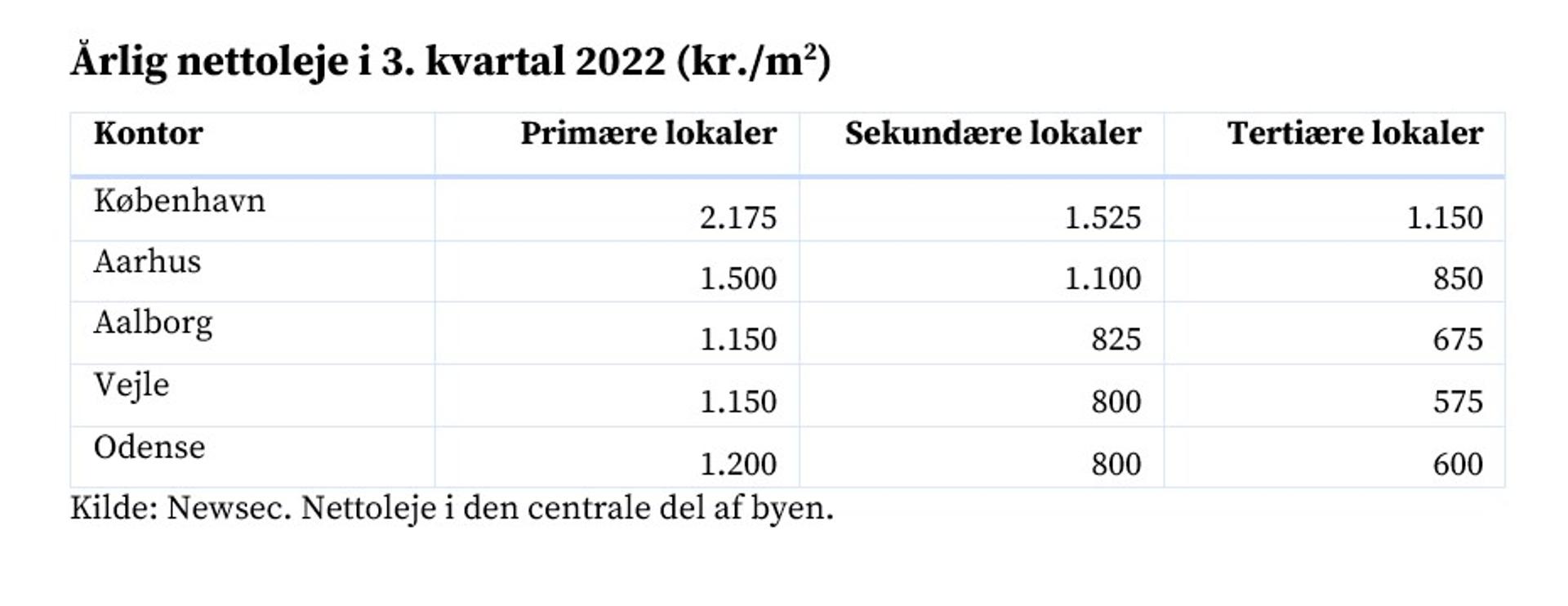 Lejen for kontorer af mere sekundær kvalitet ligger på 1.600-1.800 kr. pr. m2 i det centrale København og på 1.000-1.600 kr. pr. m2 i andre dele af byen.