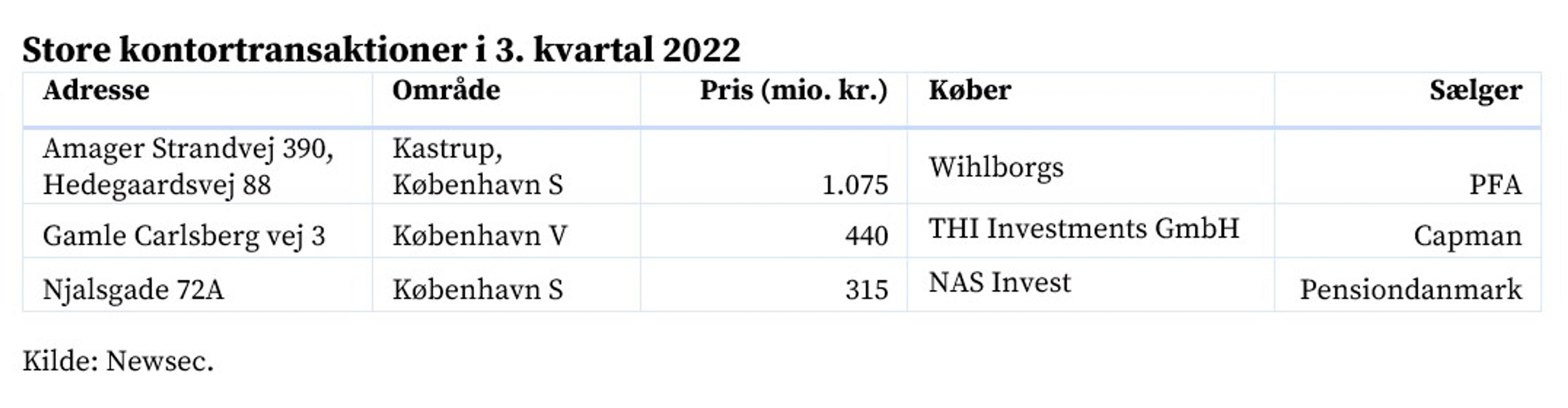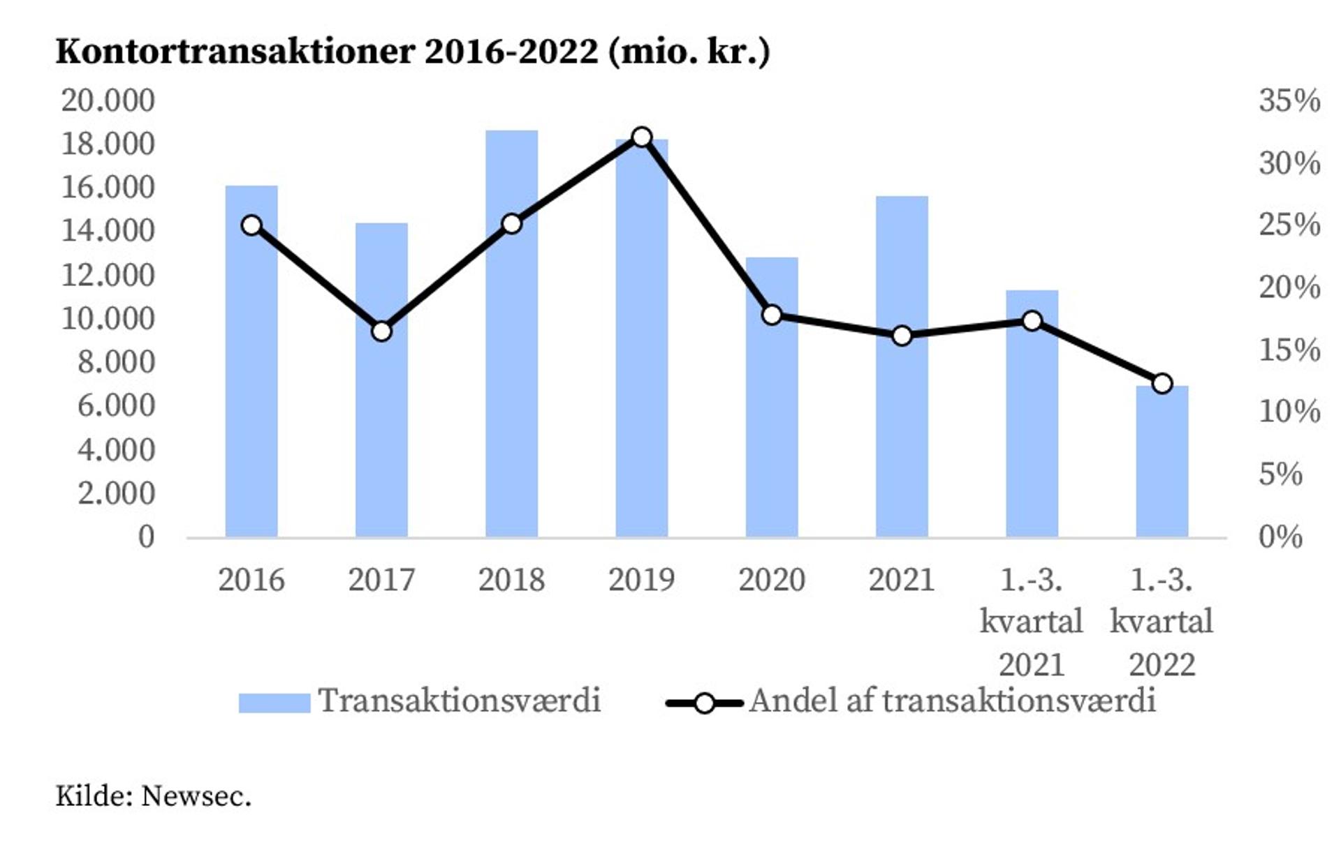Kontorejendomme repræsenterer normalt 25-35 pct. af de totale ejendomsinvesteringer, men har tabt markedsandele i de senere år. Fra 2019 til 2022 er markedsandelen faldet fra 32 pct. til 12 pct. Det svarer til transaktioner for 6,5 mia. kr. i de tre første kvartaler af 2022 (44 pct. lavere end 2021). I 3. kvartal blev der handlet kontorejendomme for 2,3 mia. kr. Det var 54 pct. højere end samme periode 2021, og et historiske set højt kvartalsniveau.