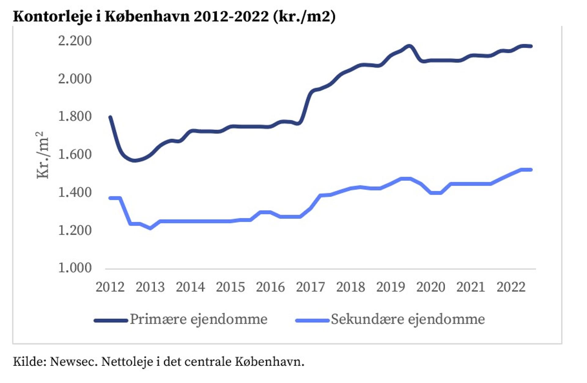 Kontorlejen for de bedste kontorer i det centrale København ligger omkring 2.175 kr. pr. m2 og på 1.525 kr. pr. m2 for kontorlokaler af mere standardmæssig kvalitet. Lejen for primære kontorer i andre dele af byen ligger lavere – i intervallet 1.425-2.100 kr. pr. m2 – afhængig af området.