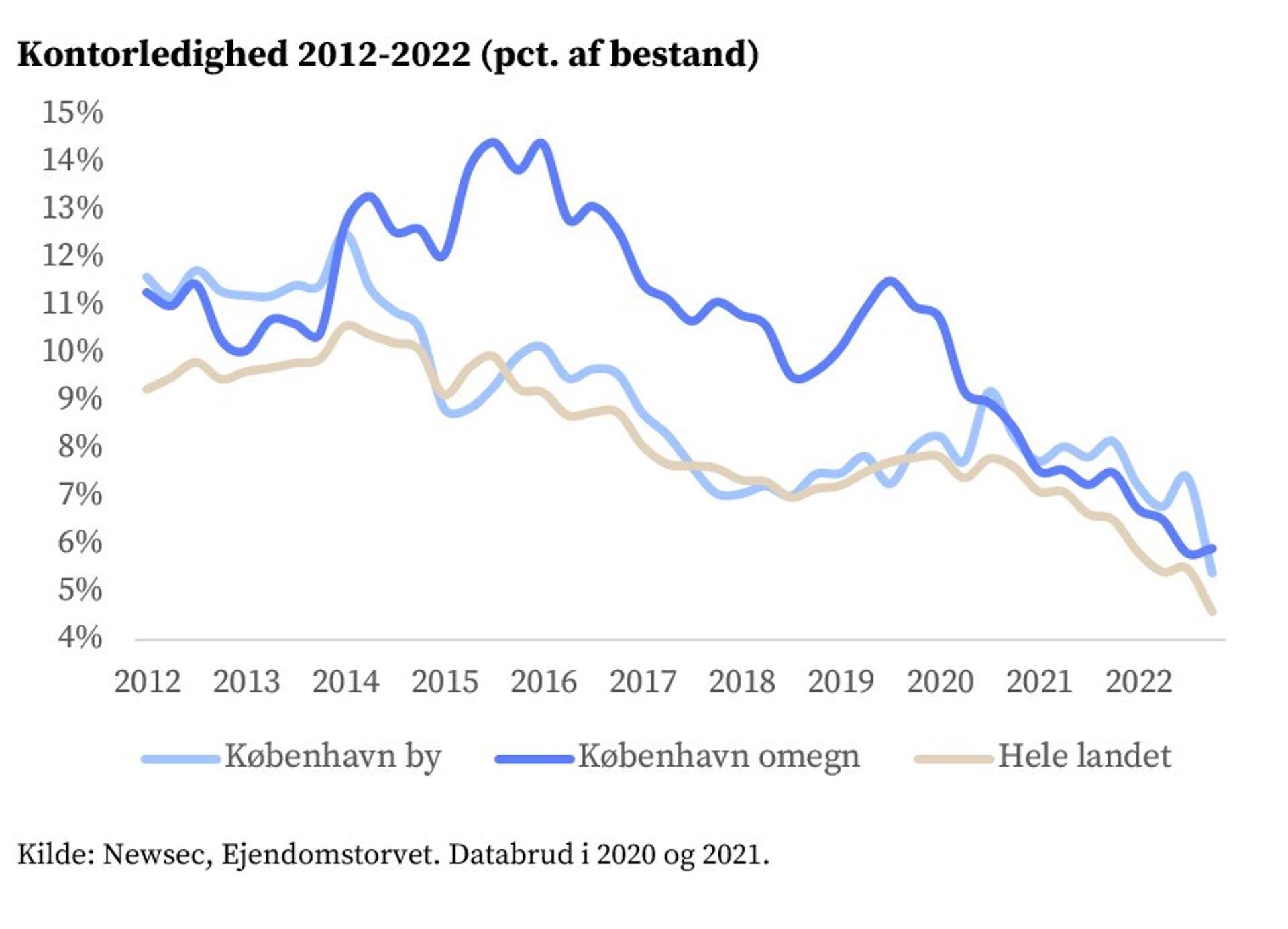 Den positive efterspørgsel efter kontorer i København har reduceret omfanget af ledige kontorer. Kontorledigheden i København by faldt markant i 3. kvartal fra 7,4 pct. i starten af juli til 5,4 pct. i starten af oktober. Det er dog sandsynligt, at ledigheden vil stige i de kommende kvartaler som følge af omfattende nybyggeri. Kontorledigheden i Københavns omegn var ved udgangen af 3. kvartal på 5,9 pct. Selvom det var marginalt højere end kvartalet før, er niveauet stadig meget lavt historisk set.
