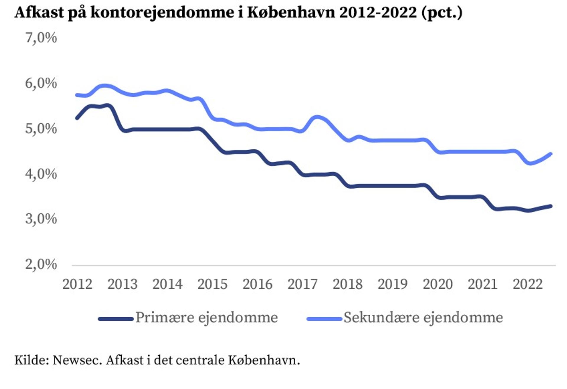 Afkastet på kontorejendomme har været faldende i en årrække. Udviklingen var mest udpræget for primære kontorejendomme. Afkastet på sekundære kontorejendomme faldt mindre.