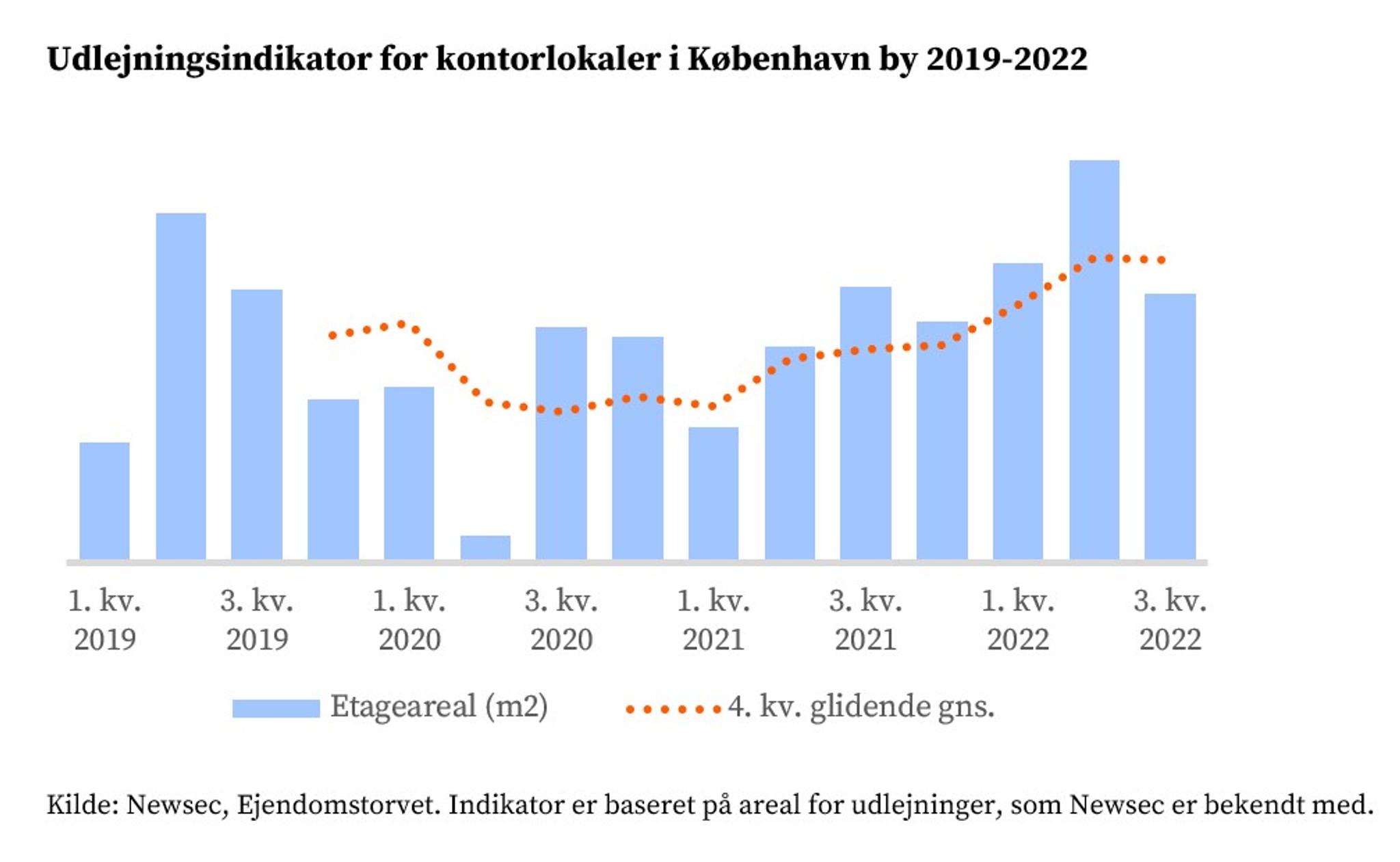 Udlejningsaktiviteten i København kom i 2021 tilbage på et mere normalt niveau i forhold til det fald, der indtraf i 2020. Antallet af udlejninger og omfanget af udlejede etagemeter var i 2021 på niveau med 2019. Den positive tendens er fortsat i 2022 med en høj udlejning i årets 1. halvår. Newsec registrerede en vis afbøjning i væksten i 3. kvartal, men omfanget af udlejede etagemeter lå fortsat på et højt niveau.