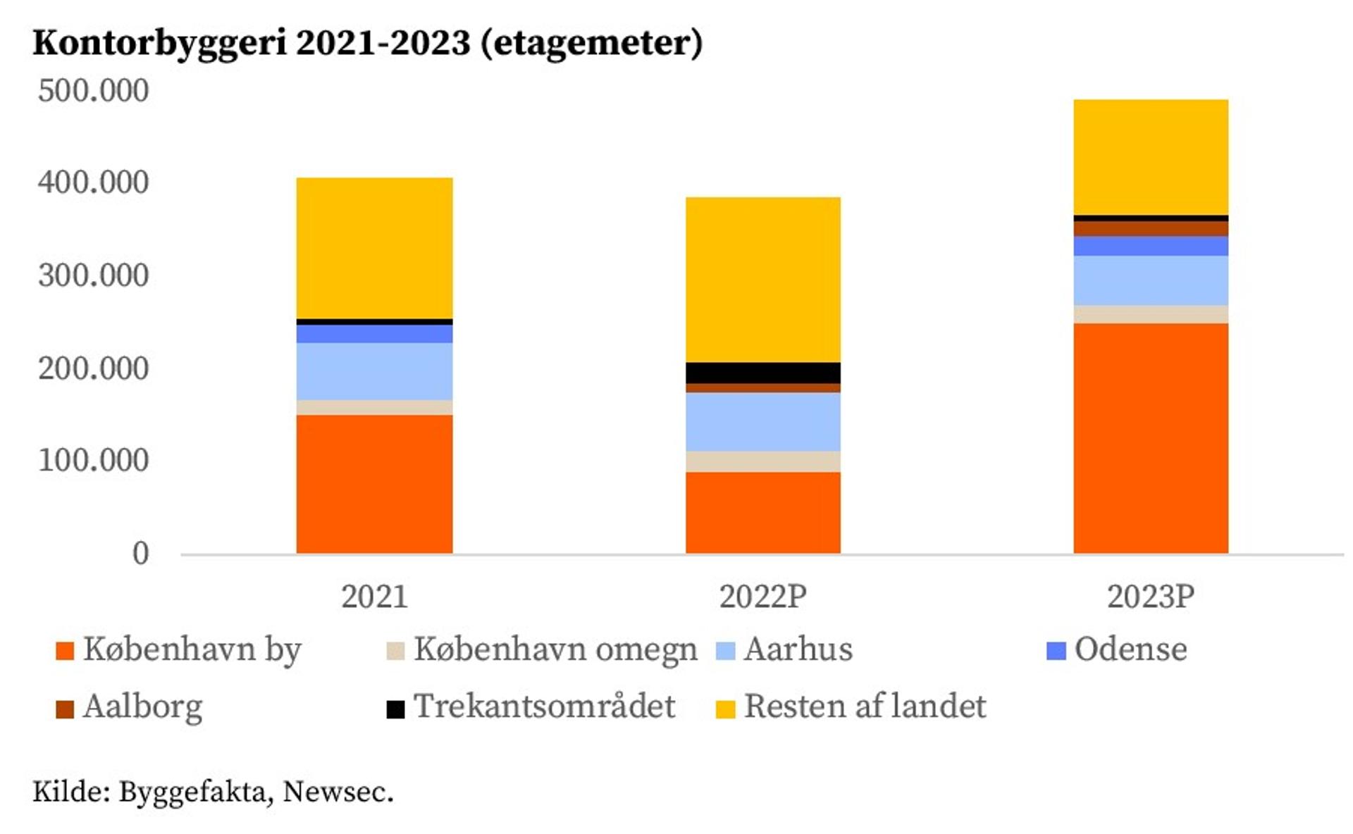 Der bygges mange nye kontorejendomme i København i disse år. I 2021 blev der bygget 151.000 etagemeter kontor i København by, og 17.000 etagemeter i Københavns omegn.