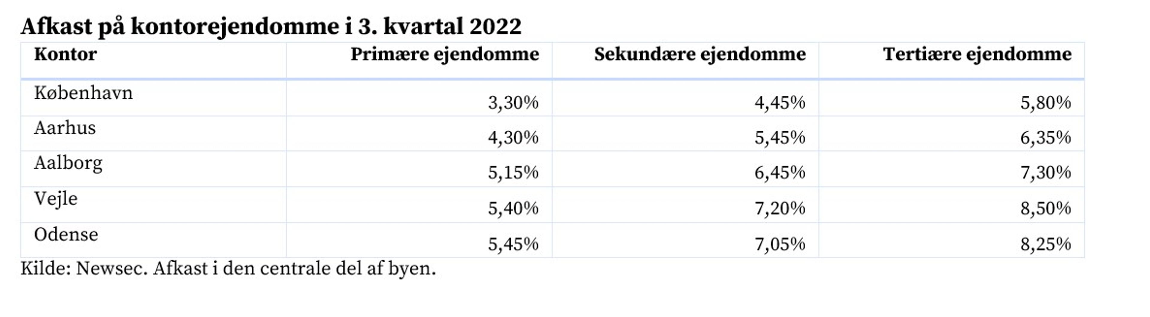 Afkastet for kontorer af mere sekundær kvalitet ligger på 4,00-4,25 pct. i det centrale København og på 4,25-6,40 pct. i andre dele af byen.