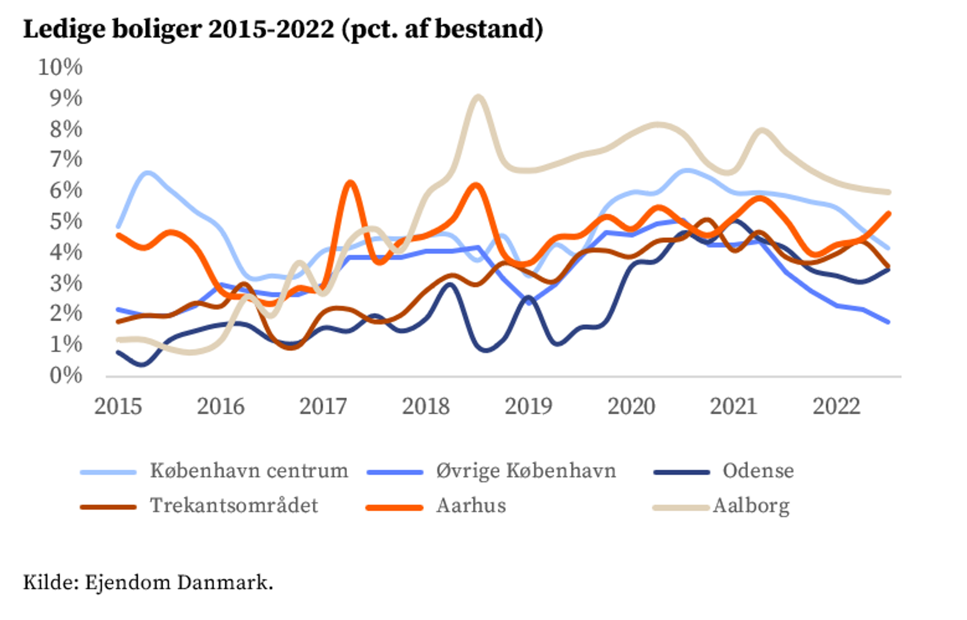 Antallet af ledige boliger er faldet markant i København. I Københavns centrum stod 4,2 pct. tomme ved starten af 3. kvartal. Faldet har været endnu mere udpræget i resten af København, hvor tomgangen var 1,8 pct. Også i Aalborg er der blevet færre ledige boliger, mens udviklingen har været mindre tydelig i landets andre store byer – stabilitet i Odense og Trekantområdet og højere tomgang i Aarhus.