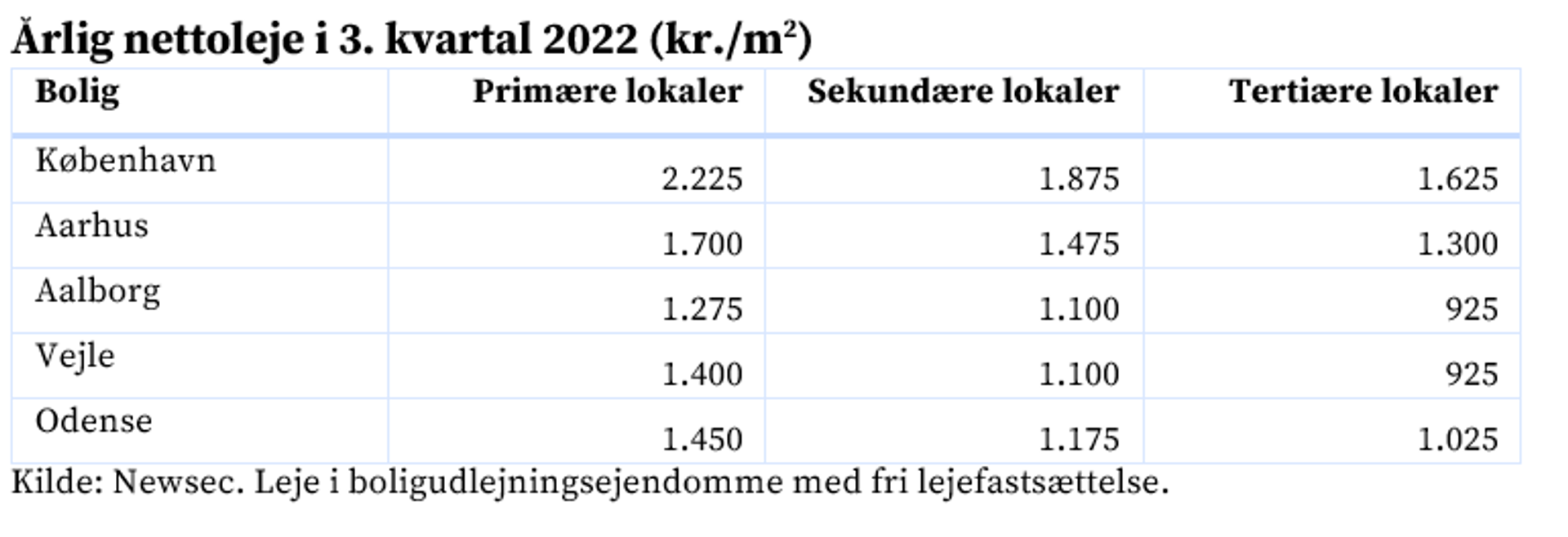 I Aarhus er niveauet omkring 1.700 kr. pr. m2 og 1.275-1.450 kr. pr. m2 i landets andre store byer.