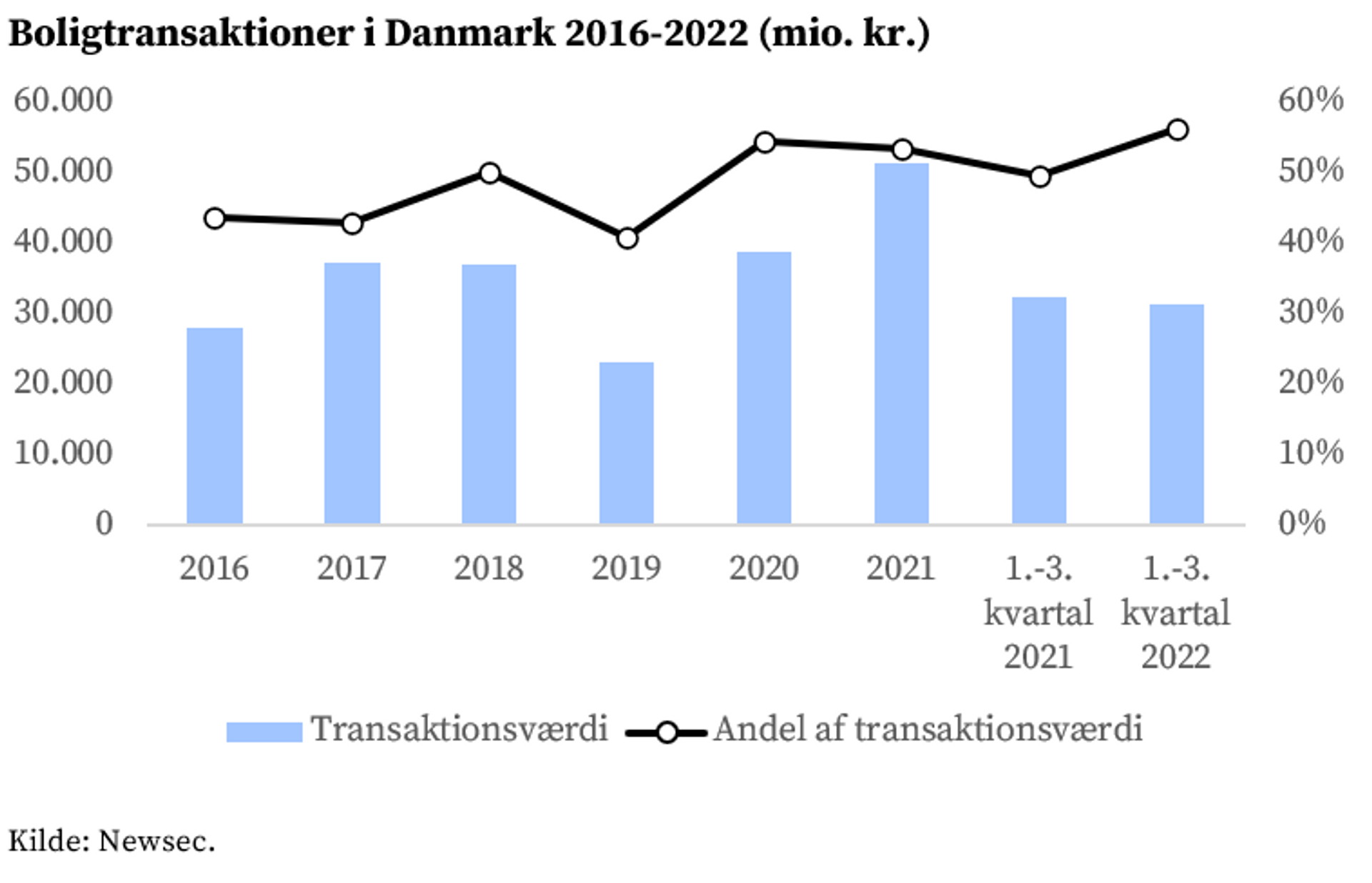 Denne udvikling vendte i 3. kvartal., hvor der ”kun” blev der handlet ejendomme for 6,9 mia. kr. Det var 53 pct. lavere end samme periode 2021. Det betydelige fald i boligtransaktionerne var den væsentligste årsag til nedgangen i den samlede investeringsaktivitet.
