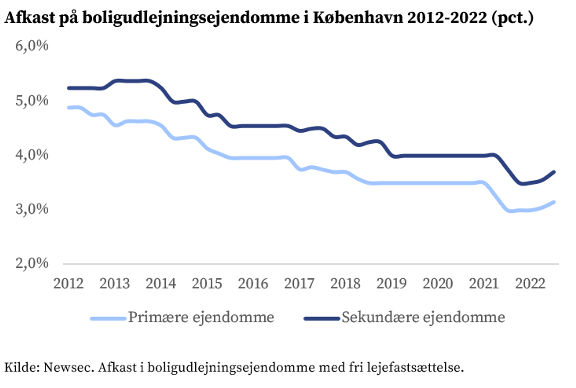 Afkastet på boligudlejningsejendomme har været faldende over en længere periode. I 2021 pressede den massive efterspørgsel fra udenlandske investorernes – i kombination med lave renter og behov for placering af kapital – afkastniveauerne yderligere ned. Den nedadgående udvikling er ophørt i 2022, og afkastniveauet har været stigende siden foråret.