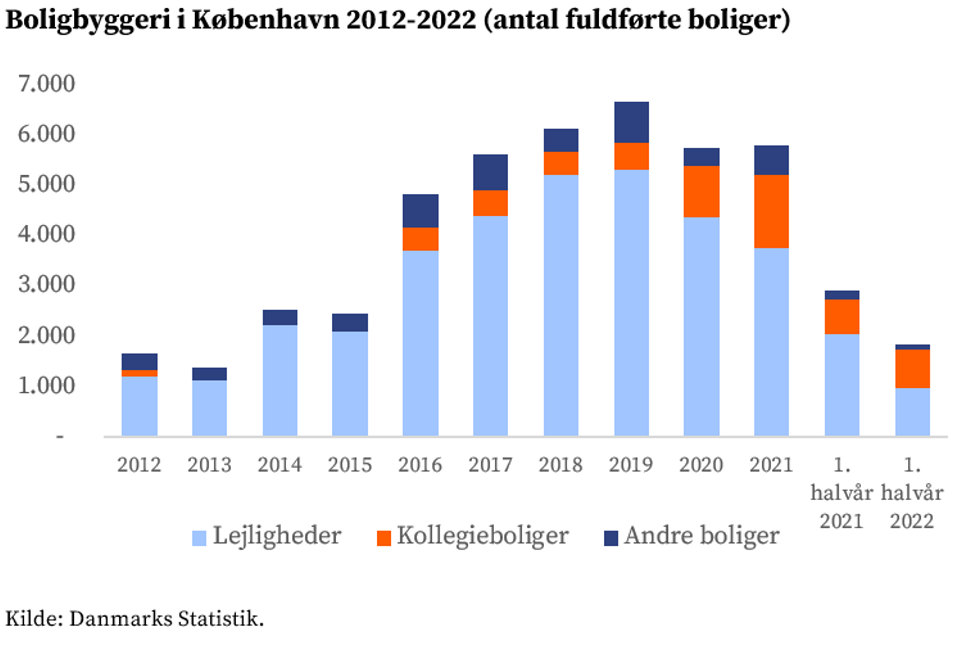 I København undergår byggeriet et markant skift i retning af flere boliger til unge mennesker og studerende. Til gengæld var antallet af færdigbyggede lejligheder det laveste siden 2016. I 2021 blev der bygget 1.500 kollegieboliger, der således udgjorde 25 pct. af det samlede boligbyggeri. Til sammenligning blev der bygget knap 3.800 lejligheder, svarende til 65 pct. af boligbyggeriet i København, hvilket er en atypisk lav andel. Tendensen er fortsat i 2022, hvor 42 pct. af alle nybyggede boliger i 1. halvår 2022 var kollegieboliger. Den udvikling vil fortsætte i de kommende år, fordi 29 pct. af alle påbegyndte boliger i 2021 var kollegieboliger, og i 1. halvår 2022 var andelen 47 pct.