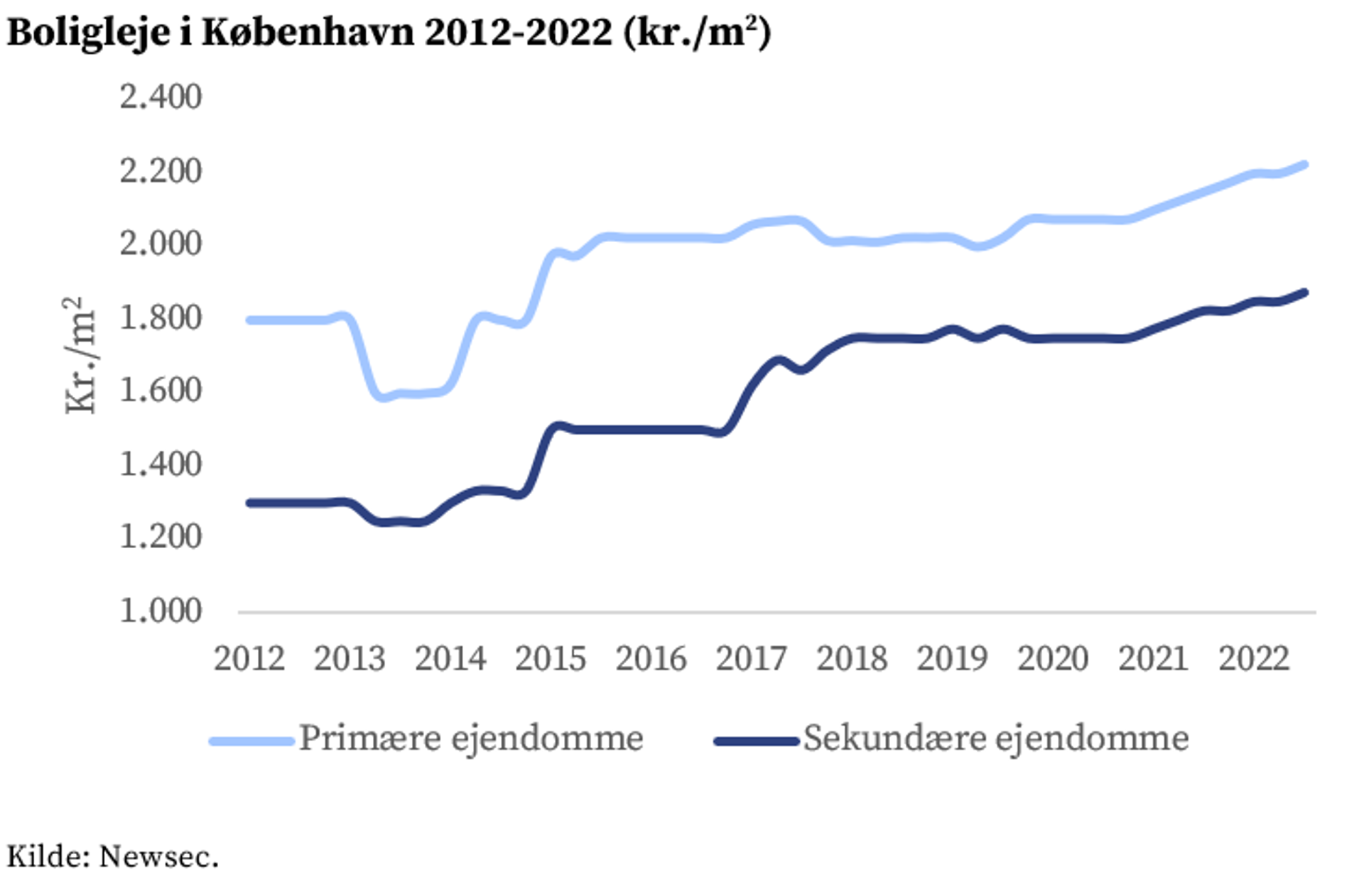 Huslejen i private boligudlejningsejendomme med fri markedsleje har været stigende i København og de fleste større byer i en årrække, og den tendens er fortsat i 2022.
