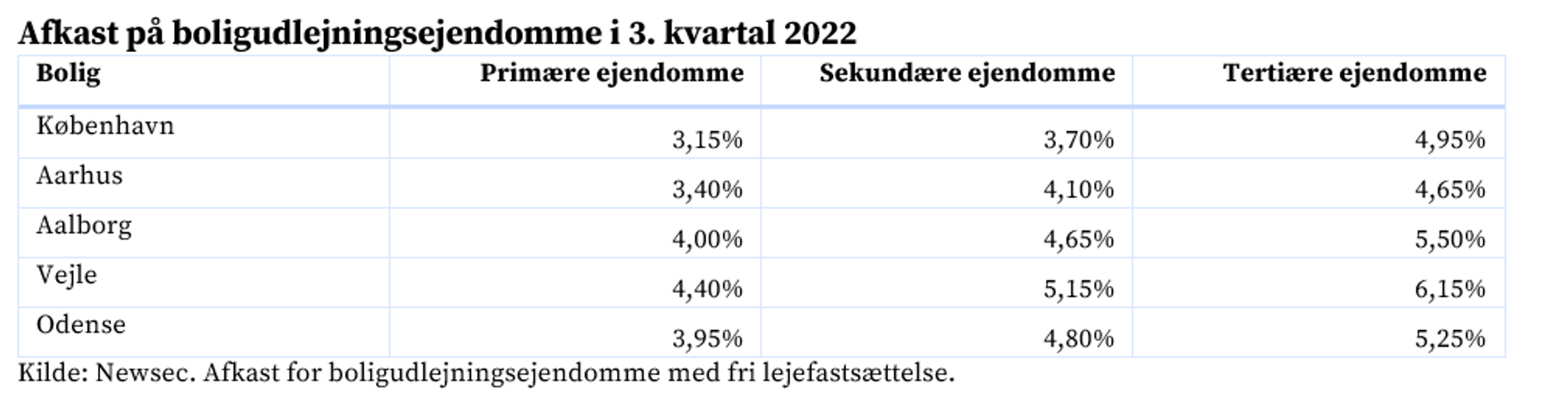 Afkastet for primære boligudlejningsejendomme med fri markedsleje i det centrale København ligger på omkring 3,15 pct. og på 3,15-3,50 pct. i andre dele af byen. Afkastet for boligudlejningsejendomme af mere sekundær kvalitet ligger på 3,40-4,10 pct. – afhængig af området.