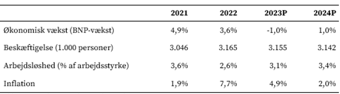 Forventning til 2023 – Der er udsigt til økonomisk recession i 2023. Privatforbrug, investeringer og beskæftigelse ventes at falde, mens arbejdsløsheden vil stige. Det er dog værd at bemærke, at tilbagegangen sker fra et udgangspunkt i 2022 med rekordhøj økonomisk aktivitet og beskæftigelse. Inflationen forventes at falde til 4-5 pct. Det er et niveau, der fortsat vil påvirke samfundsøkonomien negativt og sandsynligvis vil medføre faldende realløn.