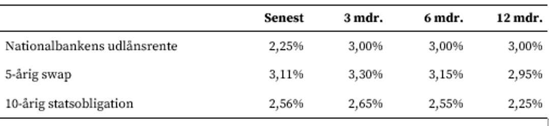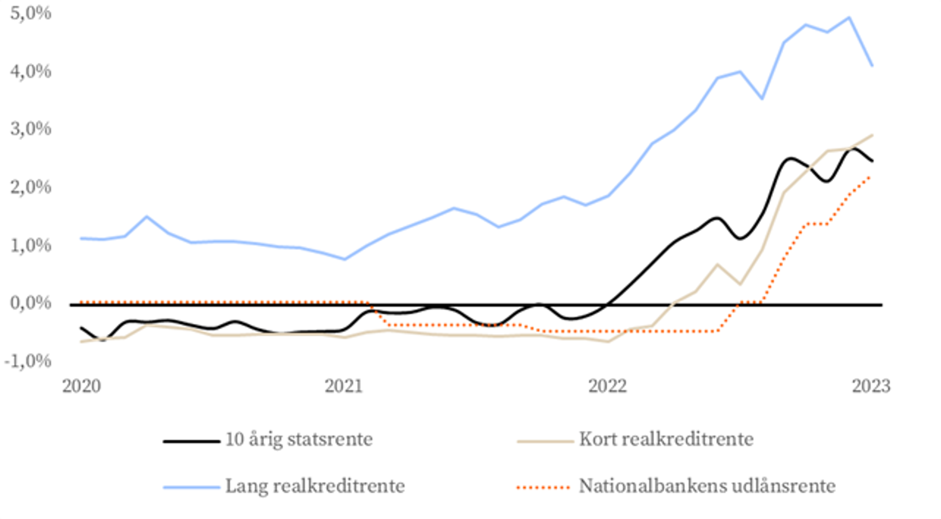 Markedsrenterne steg betydeligt mere end de pengepolitiske renter i 2022. Den 10-årige danske statsrente steg fra -0,2 pct. til 2,7 pct. Den gennemsnitlige lange rente på realkreditobligationer gik fra 1,7 pct. til 5,0 pct. Stigningen i de korte renter var endnu større. Udviklingen har i 2023 indtil videre været mere tvetydig med stigende korte renter, mens de lange renter er faldet.