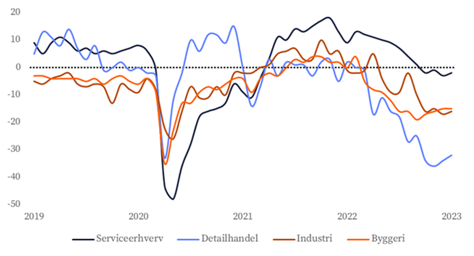 Konjunkturindikation – Erhvervstilliden blev kraftigt forværret i 2022. Pessimismen toppede i 4. kvartal, og selvom de seneste tal viser tegn på stabilisering, er konjunkturindikatorerne negative i alle hovedbrancher. Værst ser det ud i detailhandlen, hvor omsætningen er hårdt ramt, og forventningerne til det fremtidige salg er præget af pessimisme. Erhvervstilliden er også lav i byggeriet og industrien. Selv i de forholdsvis robuste serviceerhverv er konjunkturindikatoren negativ.