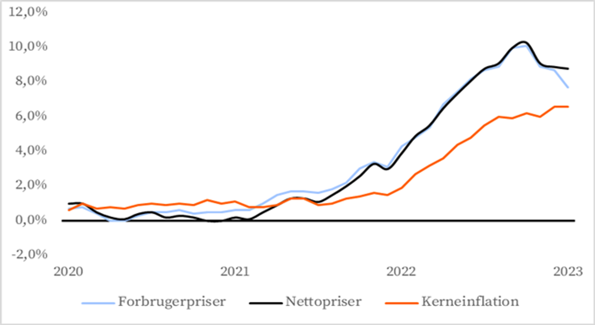 Inflation – Inflationen toppede i oktober 2022 med en stigning i forbrugerpriserne på 10,1 pct. Stigningstakten er aftagende og lå i januar på 7,7 pct. Inflationen er ikke længere primært drevet af højere energipriser, men har spredt sig til mange andre varer og tjenester – navnlig fødevarer – og kerneinflationen har ligget på et højt niveau over 6 pct. i en længere periode.