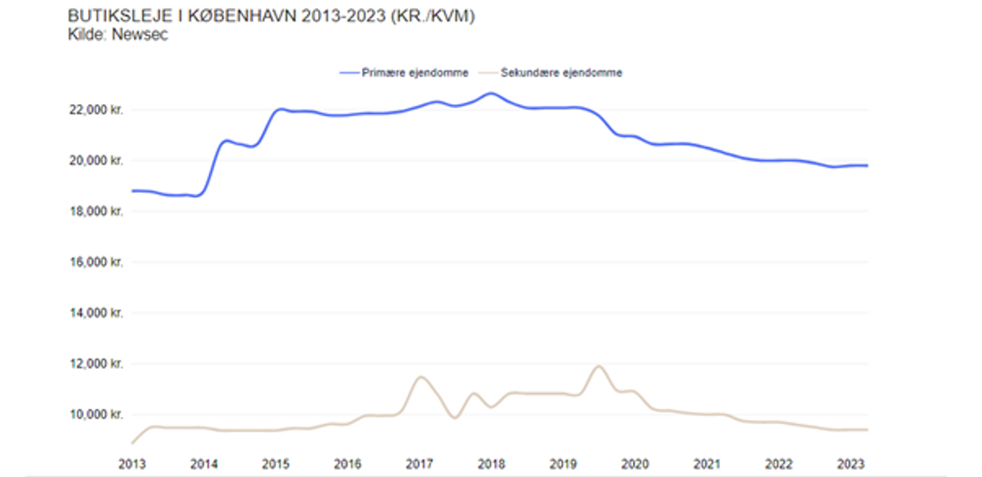 Lejeniveauerne for butikslokaler er faldende i de fleste større byer, herunder også i København. Den generelt nedadgående tendens fortsatte igennem hele 2021 og ind i 2022. På de centrale beliggenheder i indre København ligger den primære butiksleje på omkring 20.000 kr. pr. m2. Butiksleje på dette niveau ses dog kun i et fåtal af de mest attraktive ejendomme på, og omkring, Strøget. I andre dele af byen ligger lejen på 2.000-3.500 kr. pr. m2. I det centrale Aarhus er niveauet omkring 5.700-6.000 kr. pr. m2, mens det i andre større provinsbyer