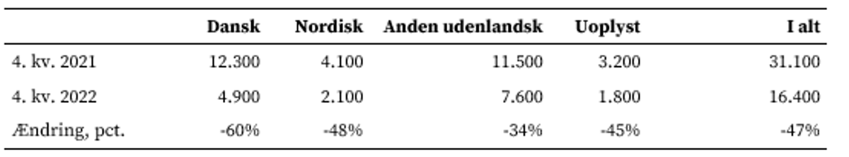 Nedgangen i investeringsaktiviteten i 2022 skyldtes, at danske og nordiske investorer mindskede deres opkøb af ejendomme med hhv. 33 pct. og 40 pct. Udenlandske købere udenfor Norden øgede derimod deres investeringer med 9 pct. I 4. kvartal var der dog også tilbagegang i transaktionerne for denne investorgruppe.