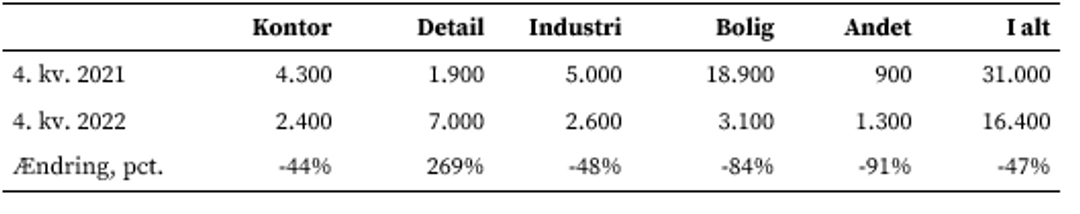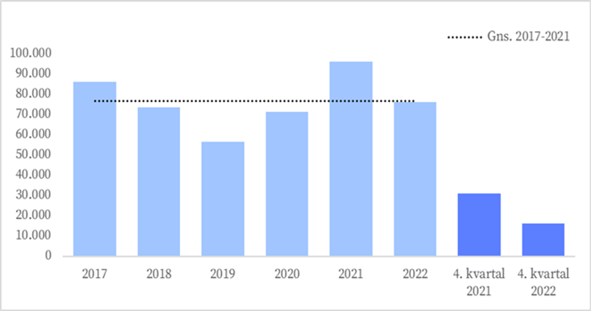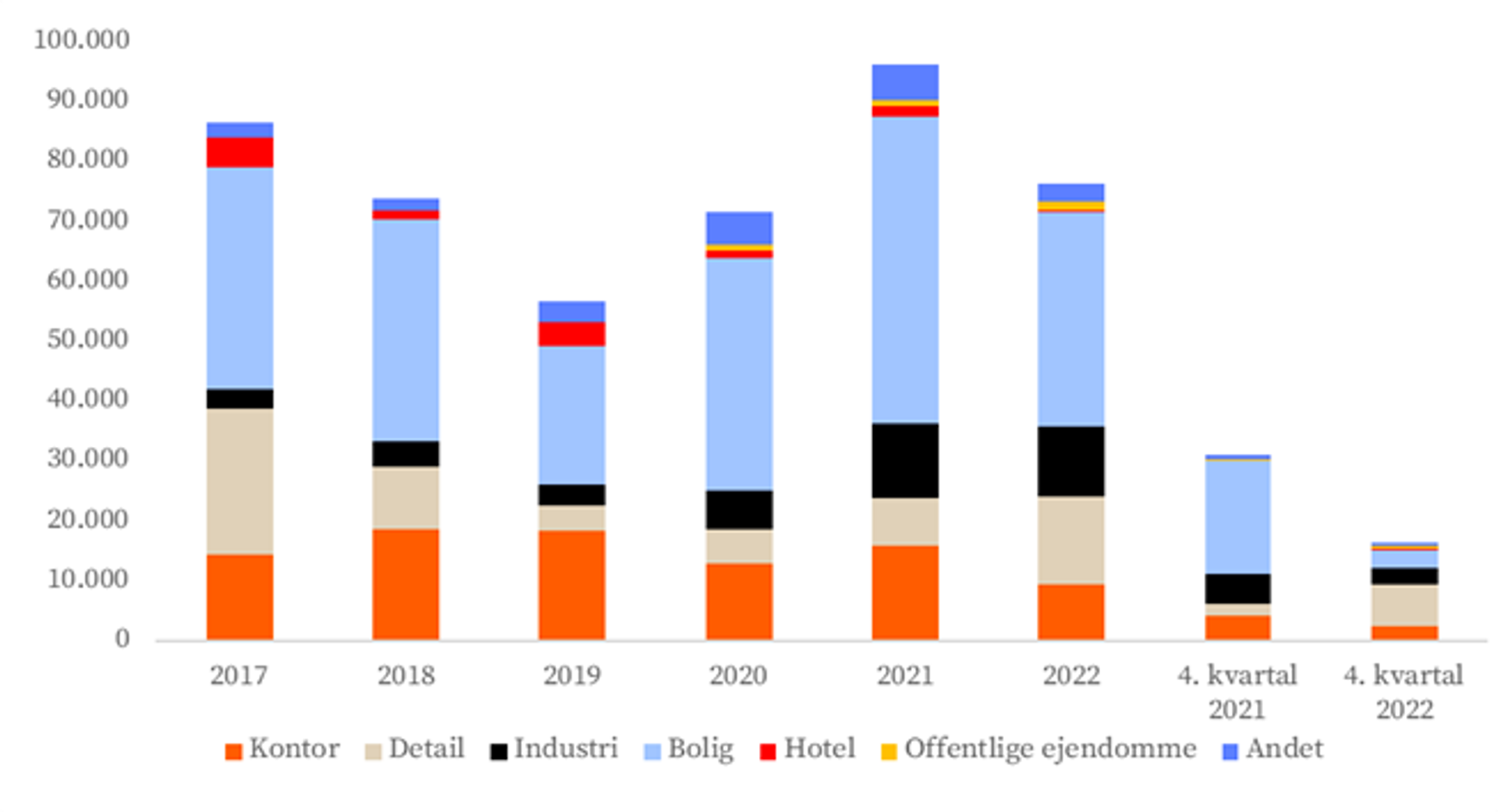 Transaktionsværdi – Der blev handlet ejendomme for 76,3 mia. kr. i 2022. Det var 21 pct. under rekordåret 2021, men tæt på det gennemsnitligt niveau i femårsperioden 2017-2021. Investeringsaktiviteten var høj i årets første halvdel, men bremsede kraftigt op i anden halvdel. I 4. kvartal blev der handlet ejendomme for 16,4 mia. kr., hvilket var markant lavere end normalt og en tilbagegang på 47 pct. sammenlignet med samme periode 2021.