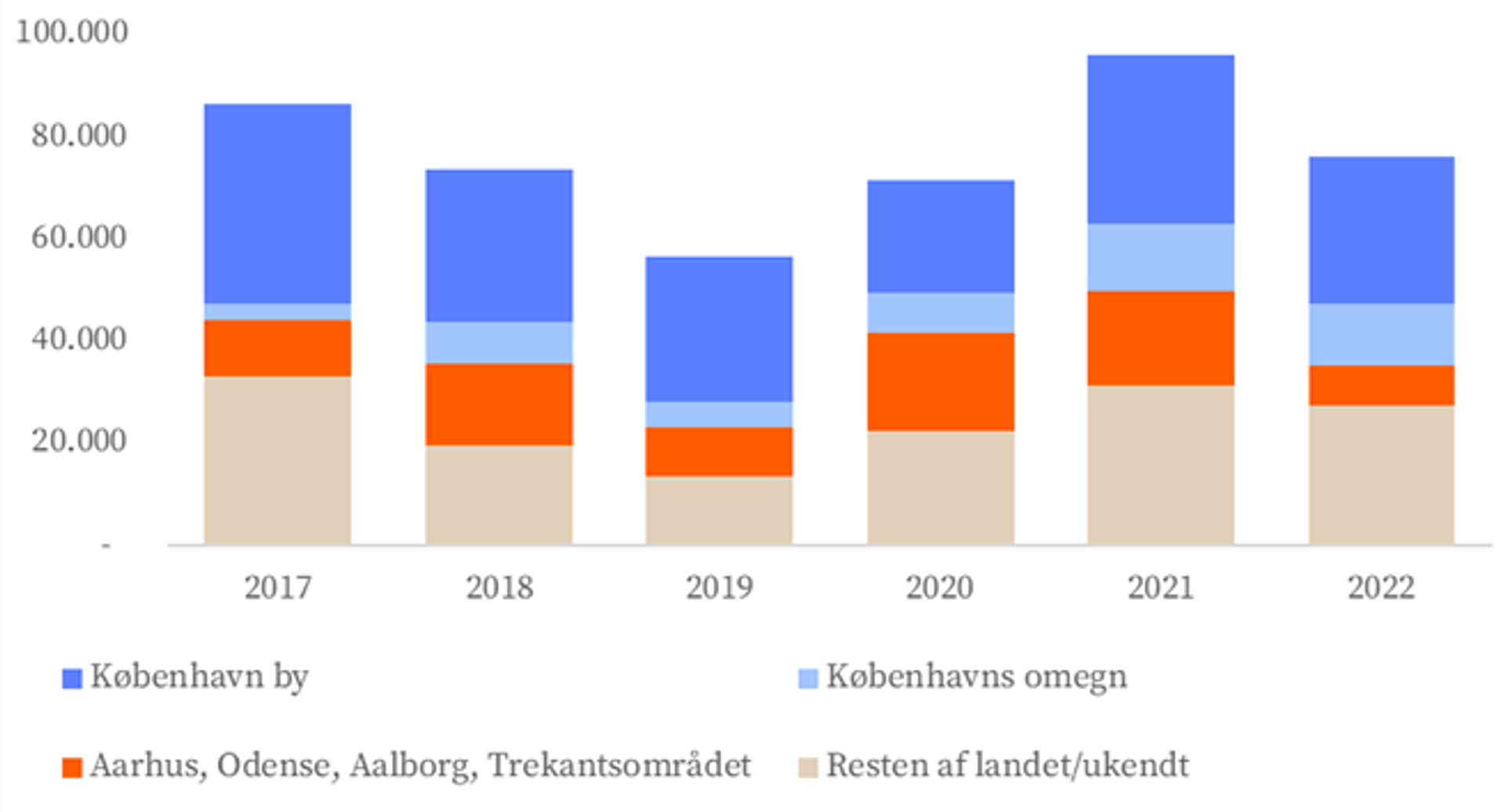 Københavnsområdet (København by og Københavns omegn) står normalt for omkring halvdelen af den samlede transaktionsværdi i Danmark. I 2022 blev der handlet ejendomme for 41 mia. kr. i Københavnsområdet, svarende til 54 pct. af den samlede transaktionsværdi. Der blev handlet ejendomme for 29 mia. kr. i Københavns by, og for 12 mia. kr. i Københavns omegn.