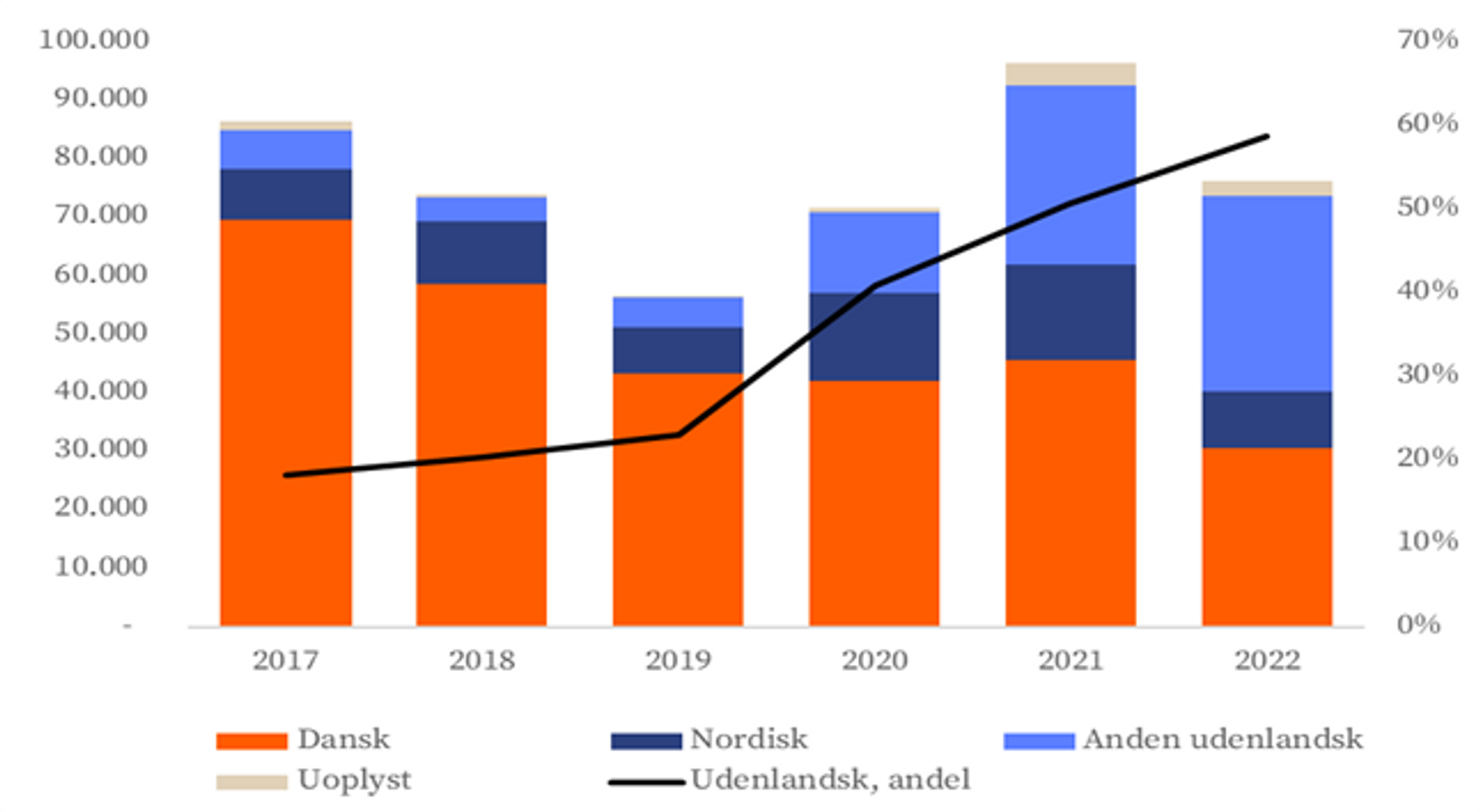 Der er sket en ”internationalisering” af de udenlandske købere. Før 2021 stod nordiske investorer typisk for 50-70 pct. af de udenlandske investeringer. I 2021 var de nordiske køberes andel på 35 pct., og i 2022 var den reduceret til 23 pct.