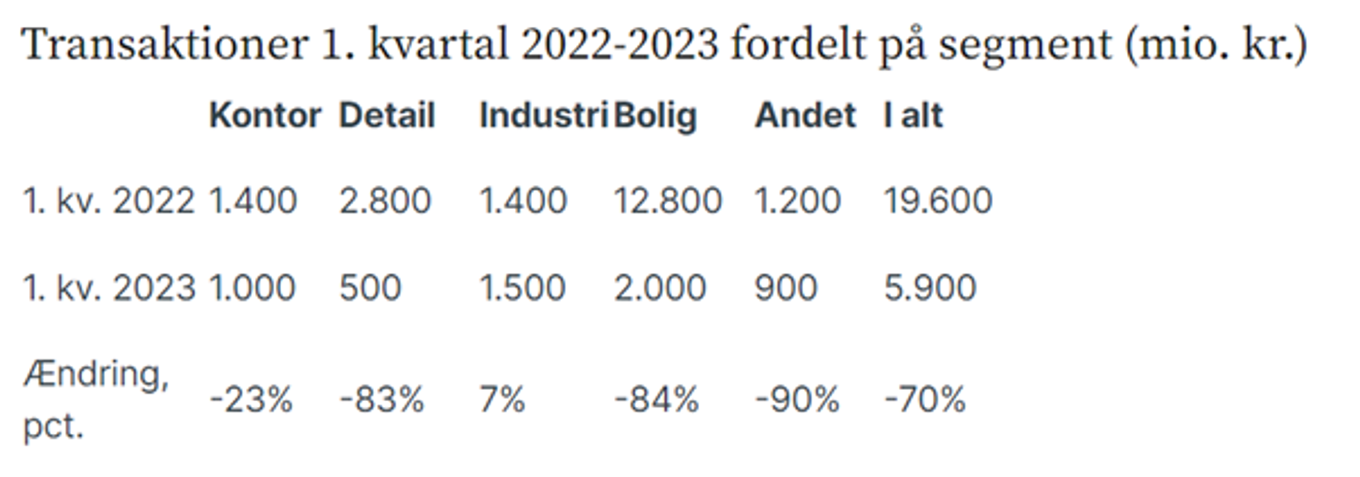 Transaktioner 1. kvartal 2022-2023 fordelt på segment (mio. kr.)