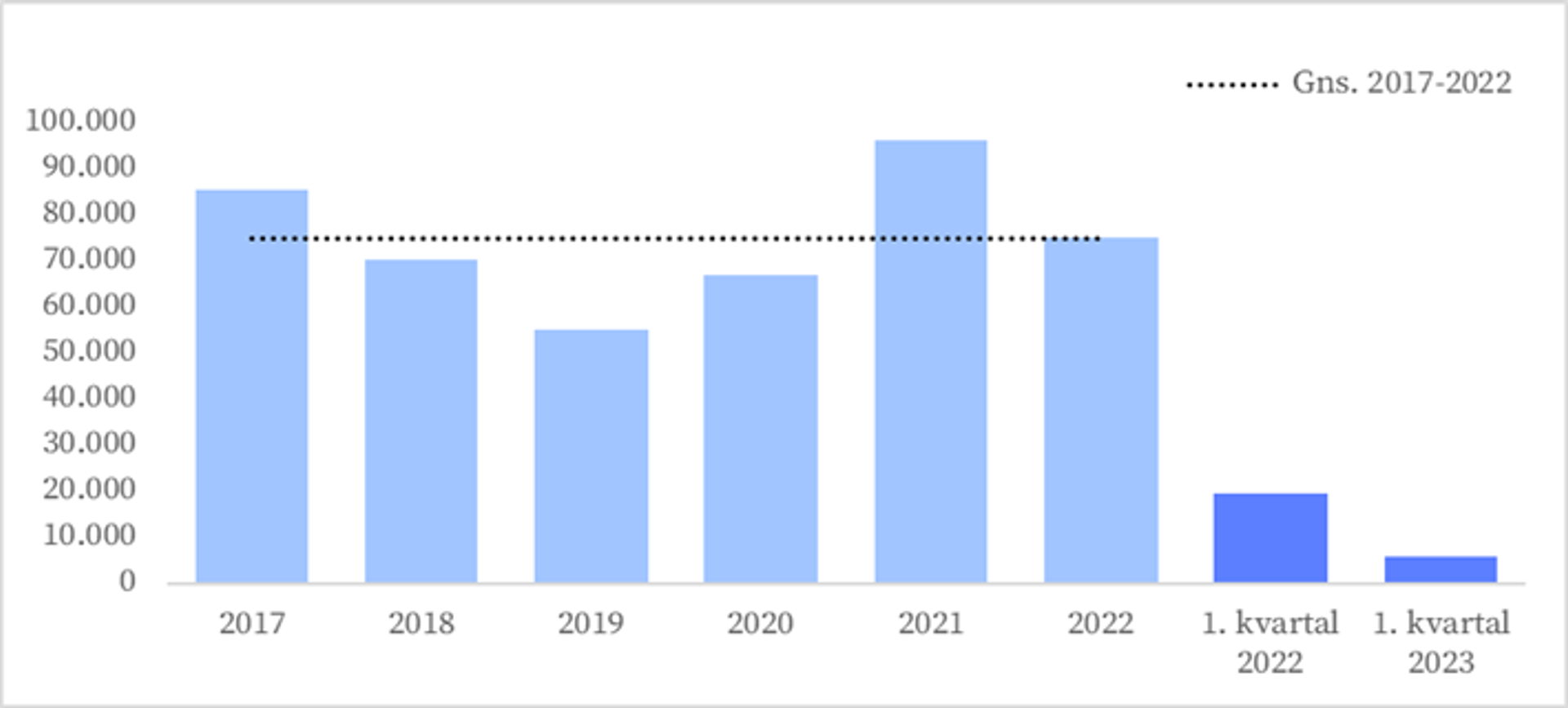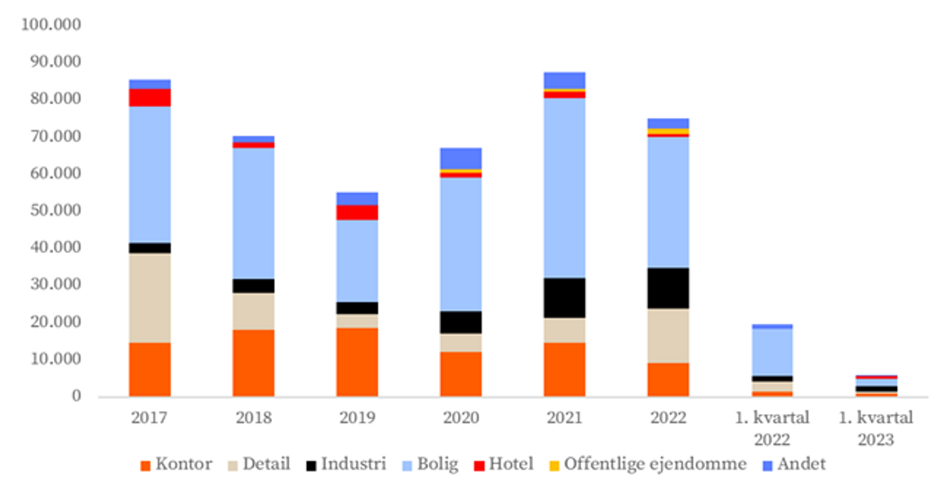 Transaktionsværdi – Der blev handlet ejendomme for 75 mia. kr. i 2022. Det var 22 pct. under rekordåret 2021, men tæt på det gennemsnitligt niveau i femårsperioden 2017-2021. Investeringsaktiviteten var høj i årets første halvdel, men bremsede kraftigt op i anden halvdel. Den lave aktivitet er fortsat i 2023, hvor der i 1. kvartal blev handlet ejendomme 6 mia. kr.
